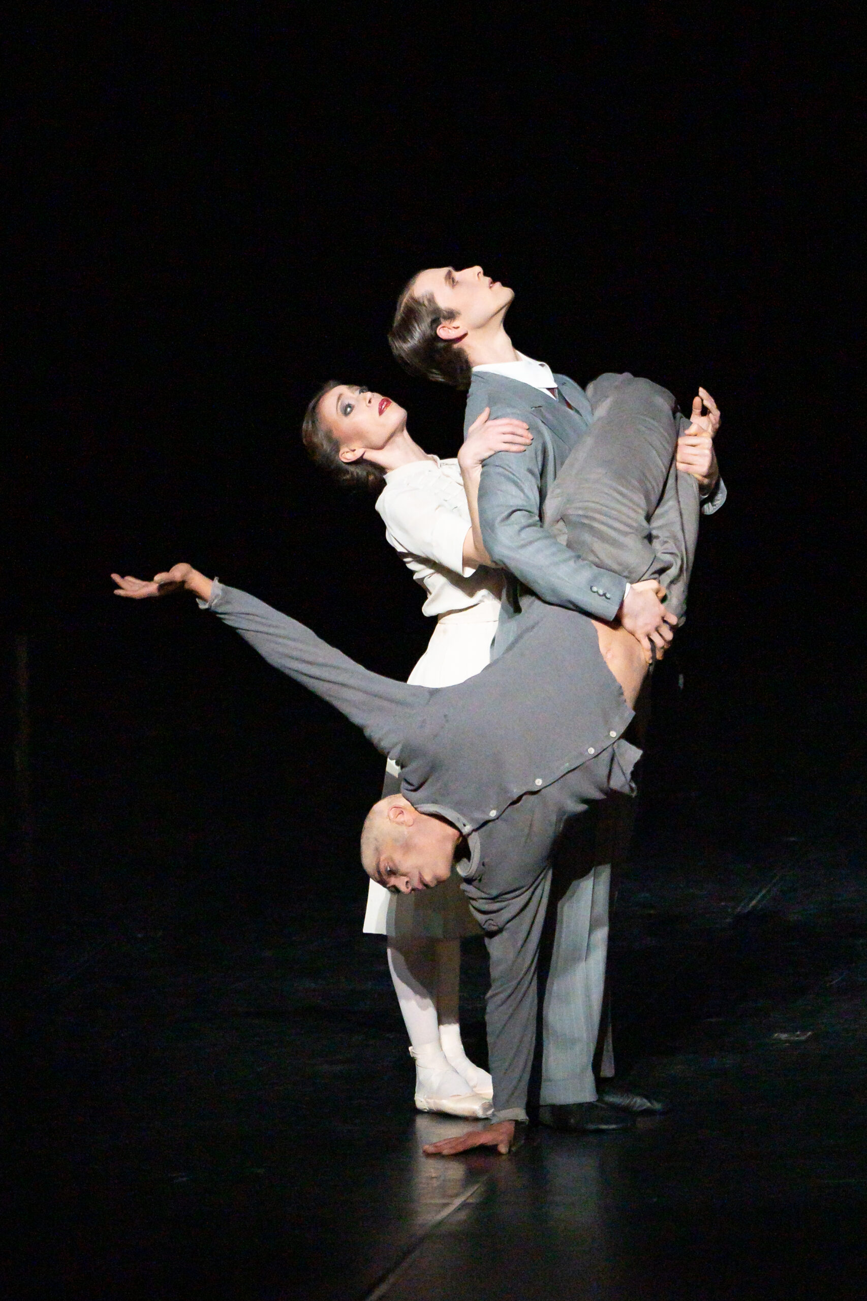 C'est enfin avec grand plaisir et grande émotion qu'on retrouve l'extrait du dernier ballet de Cranko, Spuren, reconstitué pour un gala il y a un an et demi, et qui entre cette fois bel et bien au répertoire de la compagnie. Seule pièce explicitement narrative de la soirée, Spuren nous ramène aux temps de la Guerre froide, avec cette femme passée de l'autre côté sans pouvoir oublier ceux qu'elle a laissés là-bas, sans pouvoir trouver un équilibre entre passé et présent – équilibre au sens le plus concret ici : le présent, son compagnon en costume-cravate, tente de la maintenir en équilibre sur le dos du passé, l'être cher victime de l'oppression qu'elle ne peut oublier. C'est à nouveau Anna Osadcenko qui est au centre de la pièce – les deux rôles masculins, tout comme le corps de ballet, qui représente à la fois les victimes de l'oppression et la société insouciante du nouveau monde, n'existent que par rapport à elle. On regrette décidément que la mort prématurée de Cranko ait rompu la transmission de l'ensemble de la pièce, mais ces quelques minutes suffisent à émouvoir profondément, malgré la platitude des costumes datés de Jürgen Rose. Anna Osadcenko exprime de tous les angles de son corps le malaise dont elle ne peut se défaire dans sa nouvelle vie ; Jason Reilly, dans le court rôle incarnant les victimes de la tyrannie qu'elle a laissées derrière elle, parvient en quelques gestes à une puissance dramatique qui impressionne.