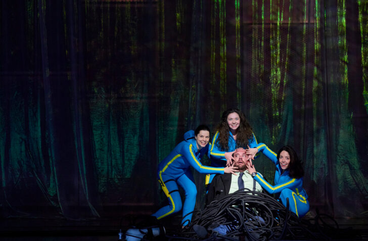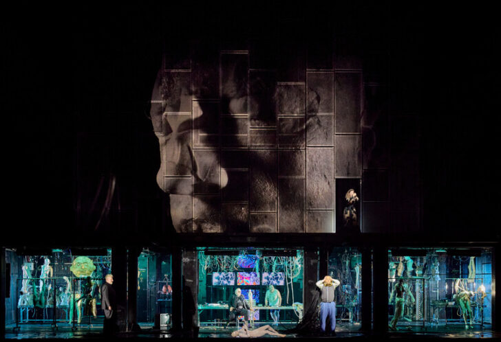 Rêve humaniste oblige, les metteurs en scène semblent avoir définitivement délaissé les vieux oripeaux de la mythologie germano-scandinave au profit de la « High Tech » : après la vision de Tcherniakov à Berlin qui situait l'action dans un centre de recherches sur le cerveau humain, c'est maintenant Calixto Bieito à Paris qui, dans une vision à la fois actuelle et futuriste, a recours à la virtualité numérique, à l'Intelligence Artificielle et au grand « rêve » transhumaniste pour nous conter les péripéties de ce nouveau Ring, en commençant aujourd‘hui par son Prologue… Avec cette nouvelle production de la Tétralogie, le metteur en scène se livre à un délicat, méritoire et ambitieux questionnement sur l'impact de la technologie et de la science sur les êtres humains, un travail particulièrement intéressant dont on appréciera l'aboutissement, l'acuité et la pertinence dans les épisodes ultérieurs à venir… Pour l'heure, il convient de signaler l'originalité et la cohérence de cette lecture, cantonnée à L'Or du Rhin, qui reste très lisible et fidèle au livret, sans pour l'instant n'apporter encore aucun sang neuf dans l'analyse en profondeur de celui-ci, se limitant à un avant-propos balbutiant, un peu grand guignolesque et superficiel.