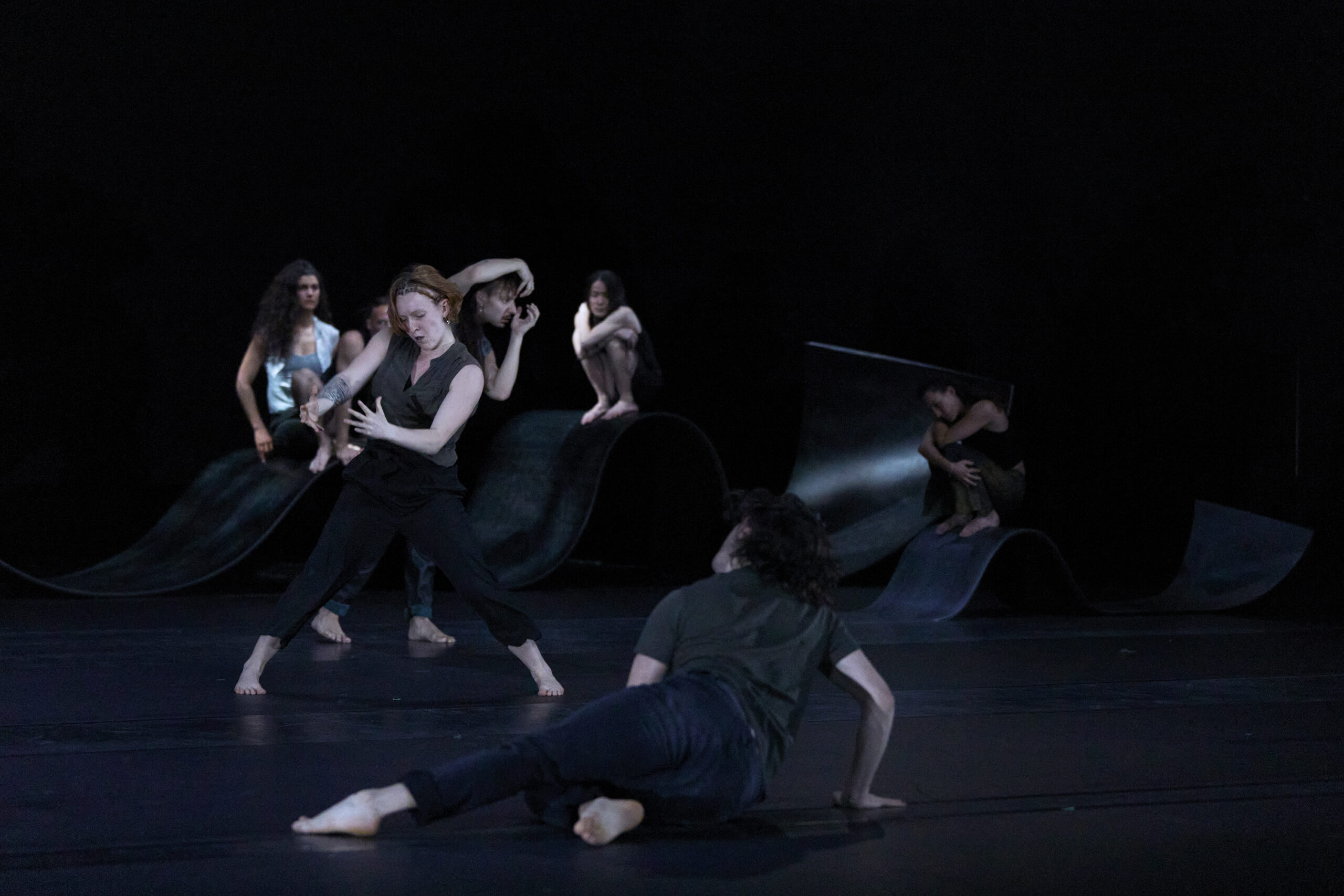 Les corps, magnifiés par la lumière sculpturale de Laurent Schaer, se déploient dans une douceur hypnotique, offrant bras et dos à la fluidité du mouvement. Une séquence plus dynamique vient rompre cette langueur : les gestes se saccadent, le rythme s'intensifie. Puis, le temps des masques s'impose, introduisant une dimension plus hermétique. Les danseurs, métamorphosés en bêtes, injectent une dose de fantastique dans la mise en scène : où se situe la frontière entre l'humain et l'animal ?