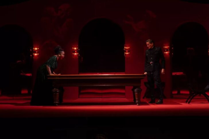 C'est dans une couleur rouge obsédante, rouge passion ou rouge sang, que la proposition scénique se révèle très éloignée d'une mise en espace. Dans une ambiance empreinte de mystère, presque fantastique, esthétiquement moderne, la tension dramatique est constante dans cet arrangement qui privilégie naturellement l'action. Au regard de la qualité du travail des lumières et des vidéos de Nicolas Descoteaux et Eric Maniengui, on se dit même que ces deux composantes scéniques, poussées au premier plan, pourraient suffire à elles seules à composer un décor d'opéra. Les quelques accessoires sur scène sont judicieusement reliés au drame, à l'instar de ce billard français dont le tapis rouge offre un joli monochrome avec le reste de la composition. Scarpia y mène la partie selon son bon vouloir, les trois boules de billard devenant une métaphore des trois protagonistes de ce drame. Pour les airs les plus emblématiques, fait le choix de positionner Scarpia, puis Tosca, seuls sur scène, sans décor, devant un rideau de scène tiré, comme pour intensifier le chant des deux interprètes.