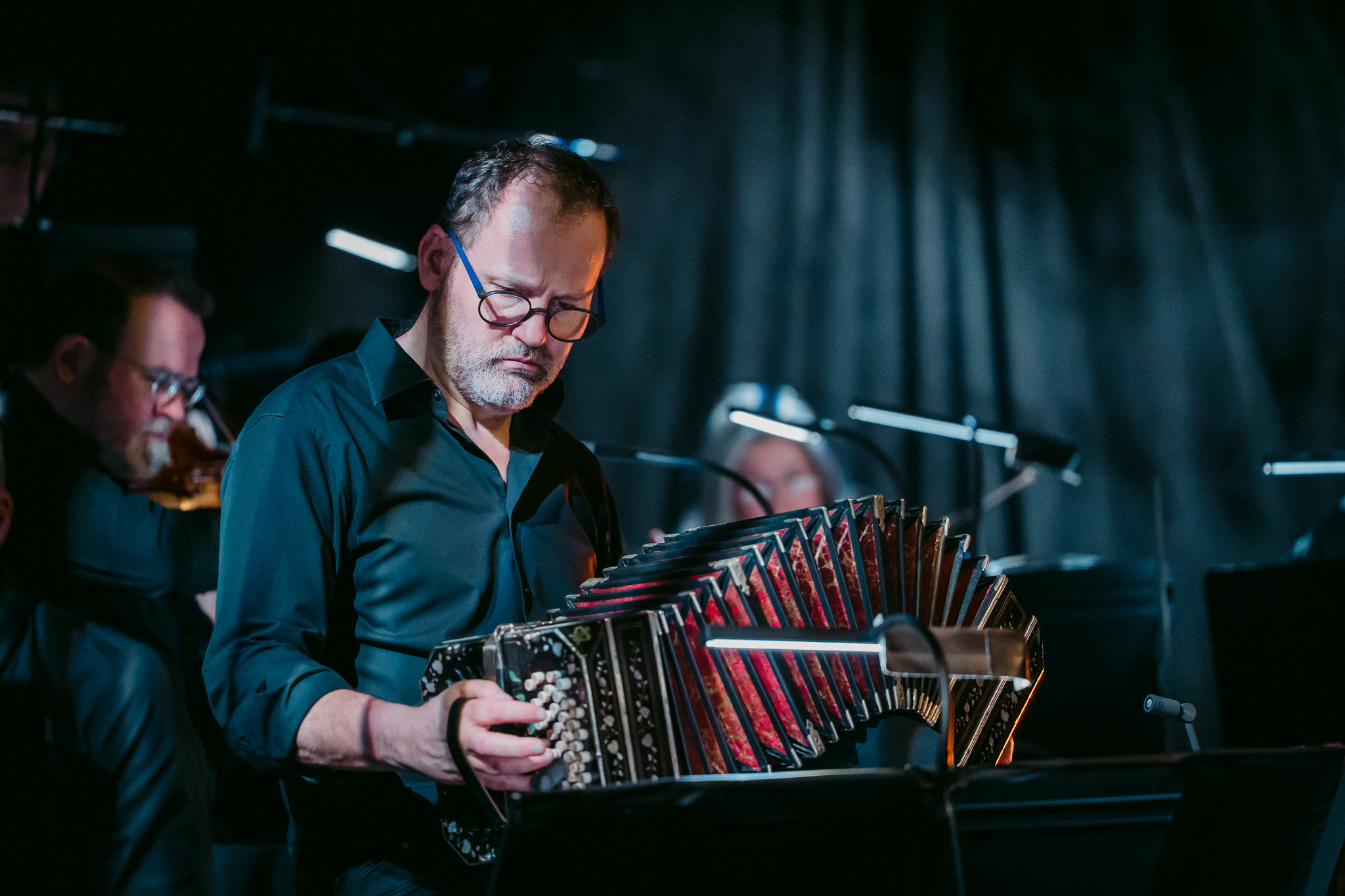 C'est à cette version originale jamais ré-entendue par la suite que William Sabatier entend revenir presque un demi-siècle plus tard, effectif orchestral de la création (onze instrumentistes) à l'appui. Une exécution palpitante, contrairement à la version entendue au Grand théâtre de Genève en 2023 mise en scène par Daniele Finzi Pasca, qui n'est pas sans faire vaciller jusqu'aux certitudes consécutives au splendide enregistrement Nonesuch dans lequel Gidon Kremer avait demandé au compositeur Leonid Desyatnikov d'arranger la partition pour huit instrumentistes, version qui n'est pas loin d'apparaître un brin policée tant ce qu'il convient de nommer dorénavant la version Sabatier, diablement plus rugueuse, charrie de fièvre et d'urgence autour de l'ardeur jusqu'au-boutiste de son bandonéon. Quasi désespérée, donnant une belle belle place à la flûte, à la guitare électrique, au quatuor à cordes (l'excellent Quatuor Terpsychordes), elle emporte l'adhésion de bout en bout.
