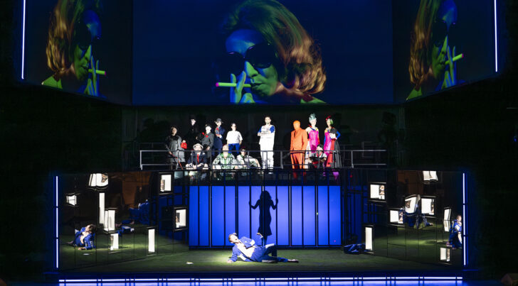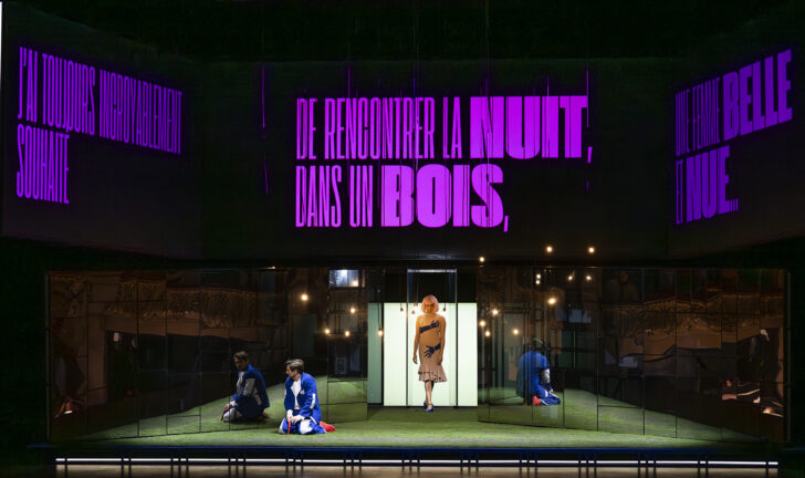 Un maelström visuel défile alors sur un décor à deux niveaux qui allèche dès l'entrée en salle avec ses miroirs renvoyant l'image d'une maison d'opéra en train de se remplir : sous un ciel de néons modulable, une sorte de retable-vidéo dédié à la rando niçoise du héros, balisé d'aphorismes (« Qui suis-je ? »…) surplombe une sorte de cabinet de curiosités aux murs mobiles tapissés de miroirs pivotants, et desquels surgissent sporadiquement quelques éléments signifiants de l'intrigue (chaussure, revolver, portrait,…). Une scénographie dotée d'un troisième niveau en arrière-plan pour le chœur, dont l'ultra-sophistication n'épargne ni les costumes (la robe de Juliette enlacée de deux bras bleus ; l'étonnant tailleur d'une hilarante mamie à chien-chien rouge), ni la colorimétrie (un Marchand de rêves orange de pied en cap). Donnant enfin la clé du songe, le troisième acte est plus spectaculaire encore, avec son Bureau des Rêves installé dans la blancheur d'une longue séance de scanner hospitalier, au terme de laquelle Michel, pressé par un machiniste qui ne cesse de répéter (même à l'adresse du chef d'orchestre) « On ferme ! » fera un choix tout à fait inattendu, mais parfaitement en phase avec cette ode au rêve (la seule chose dont l'être humain ne peut être privé) qu'est Juliette ou la clé des songes. Un choix finalement bien tentant aussi pour le spectateur malmené par son époque…