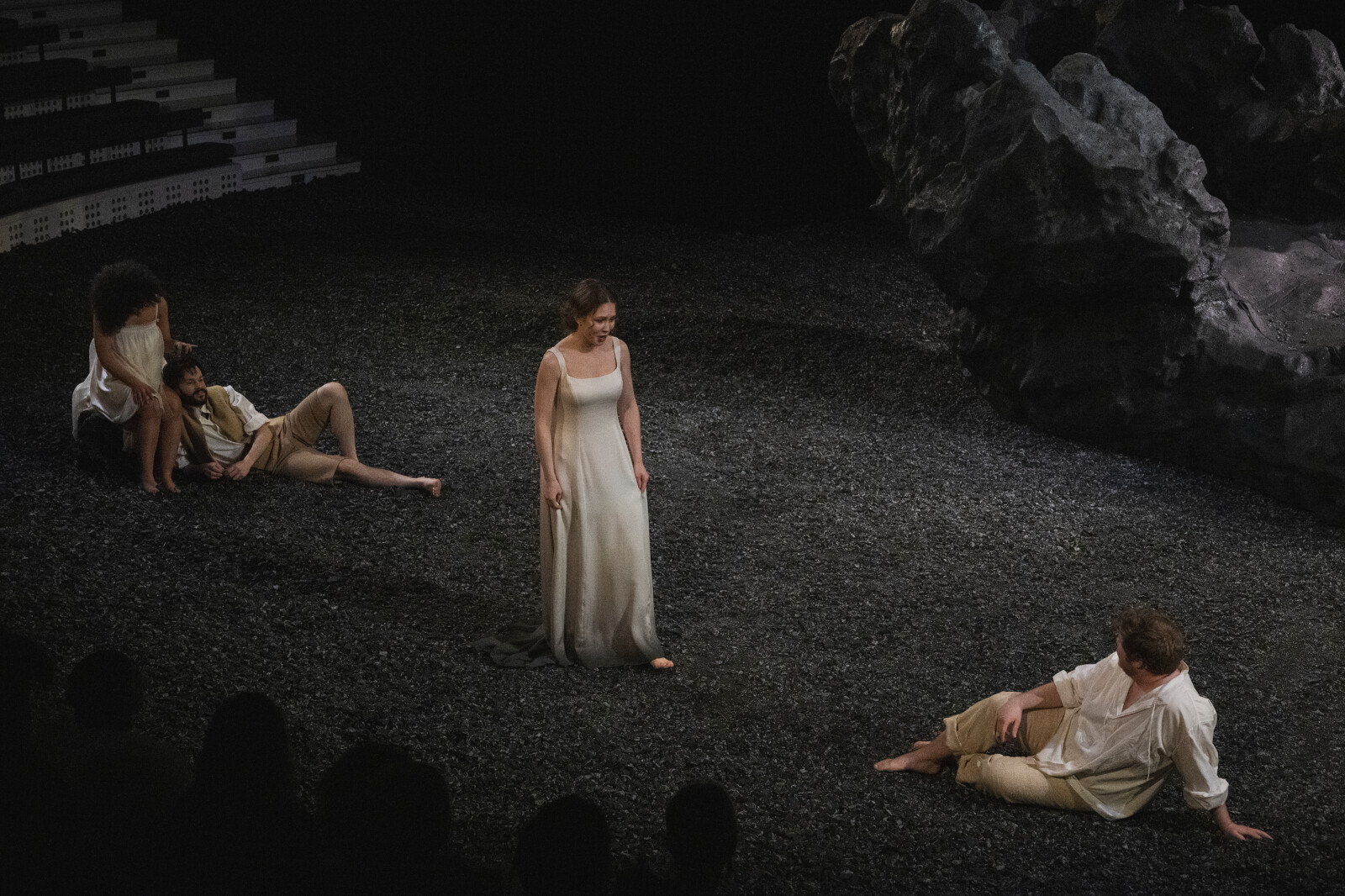En quelques éléments, puisque cette mise en scène est prévue pour l'Amphithéâtre de l'Opéra Bastille, Simon Valastro installe l'action dans un lieu désertique, où d'un parterre de cendre ne ressort qu'une grande pierre centrale volcanique (décors de Lucie Mazières), ce lieu pouvant, sous les lumières d'abord sombres, puis de plus en plus claires (James Angot) s'apparenter aussi à un paysage lunaire. Les costumes (Angelina Uliashova) tranchent par leur clarté, avec des robes blanches immaculées pour les deux solitaires, et des vêtements marron clairs et blancs pour leurs charmants sauveurs. Bien conçue pour donner toute la place aux chanteurs, la proposition scénique permet de découvrir pendant huit soirs deux distributions très différentes, qui influencent la direction du chef et mettent en avant huit chanteurs, pour la plupart d'une qualité égalant celles de nombreux artistes confirmés.