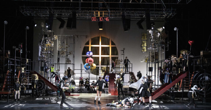 C'est sur le ton de la fable qu'elles nous content leur histoire, dans un décor fantastique, si ce n'est futuriste, qui a renoncé aux instrumentistes – le chef Louis Gal est seul dans la fosse! – au profit d'un orchestre-machine, soumis aux lois des algorithmes, qui constitue la part essentielle de la scénographie. Les structures en fond de scène sont impressionnantes, conçues par Jane Joyet : bâtons de pluie comme des hélices géantes tournant autour d'un axe, tubes métalliques et autres plaques tonnerre aussi actives que sonores, soit du bois, du cuivre et du laiton, vestiges de l'orchestre qui n'est plus : ça râle, ça tourne, ça chantonne, ça roule, ça résonne tout au long du spectacle. Trois toboggans rouges et un tapis roulant en bord de scène cernent l'espace de jeu de quelque cinquante enfants (de 7 à 14 ans) acteurs, chanteurs et danseurs – sachant qu'un second casting du même effectif se produira en alternance au fil des représentations. Ils sont tous et toutes issus de la Maîtrise de l'Opéra de Lyon, conviés sur scène pour interroger voire incarner le futur : un dispositif « sans modèle préalable », fait remarquer Diana Soh, soucieuse dans tout ce qu'elle entreprend de renouveler les formats scéniques et de nous surprendre dans le processus de son travail.