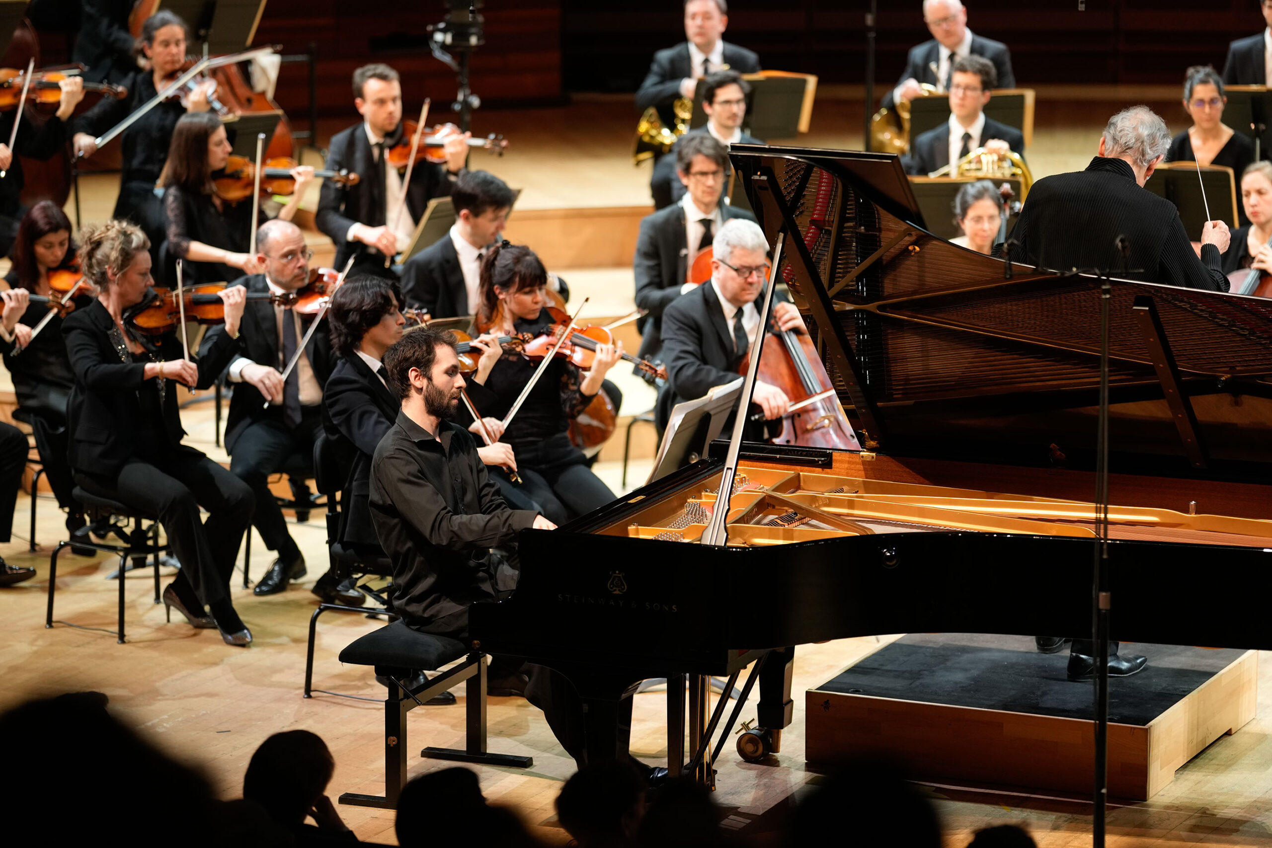 Au premier concert, il entre dans le Concerto n°1 en ré mineur opus 15 brusquement, avec des timbales très présentes et des équilibres limités par le placement de l'orchestre sur la scène de l'Auditorium de Radio France. En deuxième position sur la gauche, les violoncelles par six ressortent trop peu, couverts par les premiers violons à leur droite et dernière eux, [.] ce groupe étant encore trop prédominant pour laisser entendre correctement les quatre contrebasses, sur un seul rang derrière. Malgré cela, le Philharmonique reste emmené avec énergie par son premier violon Nathan Mierdl, et à de multiples reprises par ses cuivres, parmi lesquels il faut louer les splendides solos de cor d'Alexandre Collard. Alexandre Kantorow entre dans cette matière avec la maîtrise qu'on lui connaît, la main gauche aussi assurée et parfois encore plus parfaite que la droite, dans une conduite du discours qui trouve en revanche, comme celle du chef, des hauts et des bas selon les parties.