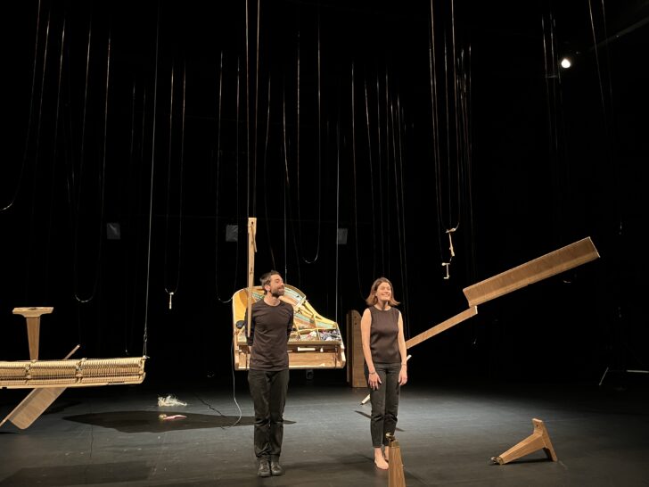 Commence alors, avec un assistant (le régisseur Théo Vacheron) car les pièces sont lourdes, le démantèlement systématique du piano, dans le calme et la beauté du geste. Chaque composante (le couvercle d'abord, les supports en bois, le pédalier, etc.) est placée en équilibre sur les filins tels des mobiles qui animent l'espace et sont donnés à voir. Quant à la mécanique (l'ensemble des marteaux), elle est exposée sur le devant de la scène, à hauteur des mains de Claudine Simon qui en joue avec dextérité : musique bruitée avec effet guïro sur les chevilles, ballet de marteaux (en solo ou ensemble) et leurs rebonds sonores. L'espace de jeu est amplifié et nous laisse apprécier cette séquence ludique et feutrée qui ravit l'œil autant que l'oreille.
