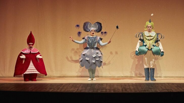 Paris. Théâtre de l’Athénée. 4-IV-2025. Félix Fourdrain (1880-1923) : Les Contes de Perrault, féérie lyrique en 4 actes. Livret : Arthur Bernède, Paul de Choudens. Mise en scène : Valérie Lesort. Conseiller artistique : Christophe Mirambeau. Scénographie, costumes et décors : Vanessa Sannino. Avec : Anaïs Merlin (Cendrillon, Le petit Poucet, Chaperon rouge) ; Julie Mathevet (la fée Morgane) ; Romain Dayez (Olibrius) ; Enguerrand de Hys (Le Prince charmant) ; Lara Neumann (Madame de Houspignoles) ; Camille Brault (Le Chat Botté) ; Éléonore Gagey (Aurore) ; Hortense Venot (Javotte) ; Richard Delestre (Croquemitaine, Meunier, Huissier) ; Philippe Brocard (La Pinchonniere, Barbe-Bleue) ; Lucie Komitès (La reine Guillaumette) ; Geoffroy Buffière (Le roi Guillaume). Orchestre et chœur des Frivolités Parisiennes, direction : Dylan Corlay