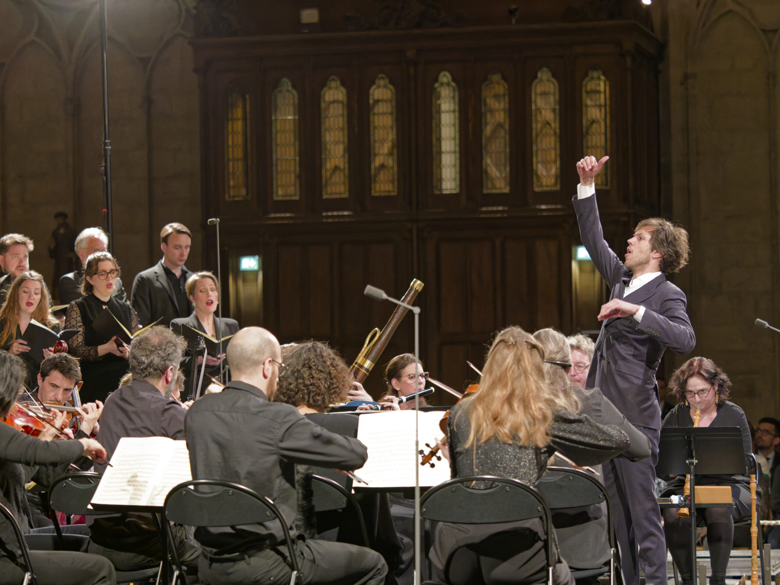 Le chœur d'ouverture porté par un orchestre aux sonorités ténébreuses et des voix unies dans la ferveur saisit par la densité expressive, et la force immédiate qui en émanent. entre d'emblée dans le propos dramatique, la musique avançant par vagues sur une grave et inexorable marche. Au fil de l'ouvrage, sa direction précise n'entraîne jamais les musiciens dans des excès expressifs, ni dans une théâtralité submergeante qui nuirait à la dimension spirituelle de l'œuvre. Il trouve l'expression juste, sensible, usant de nuances très fines, offrant une lecture musicalement très aboutie et sans cesse habitée. Les instrumentistes (excellent continuo et solistes), dialoguent en parfait équilibre avec les chanteurs et les chœurs, qu'ils soutiennent à la perfection dans leurs interventions diverses. Le chœur (formé de celui de Pygmalion et celui de la ), impressionne par sa cohésion, par l'intelligibilité du texte clairement articulé, par l'engagement des chanteurs dans les différents « rôles » qu'ils incarnent au fil du drame (la populace, les soldats réclamant la crucifixion, les chrétiens exprimant leur foi dans la ferveur et la prière). Les chorals sont magnifiquement conduits, chantés avec une profondeur particulièrement émouvante.