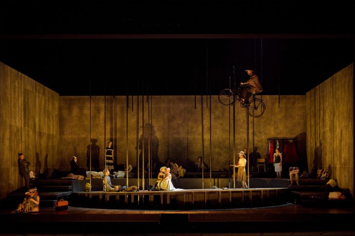 Le livret est structuré en deux actes et pas moins de 41 scènes, pour 1h50 de musique : la complexité du récit, le nombre de personnages, les incessants changements de lieu et de temps, additionnés à l'alternance peu justifiée entre espagnol et allemand dans le livret, auraient nécessité une mise en scène fluide, capable de passer d'un univers à l'autre en quelques secondes. Le décor de Henrik Ahr se compose de trois murs de couleur passe-partout et de praticables qui donnent du relief au plancher de la scène, sans parvenir à en donner aux évolutions des personnages et surtout de la foule constituée de l'ensemble vocal et de nombreux figurants. La mise en scène de Tatjana Gürbaca ne cesse de disposer et de réarranger cette foule, sans parvenir à donner corps aux personnages ni à raconter leur histoire. Bien nous a pris de lire le roman avant le spectacle : on doute fort qu'il soit possible de comprendre les relations entre les personnages et les différentes étapes du parcours d'Eisejuaz à partir de ce qu'on peut voir et entendre au cours du spectacle.