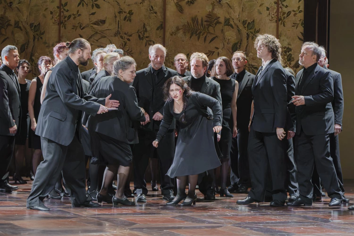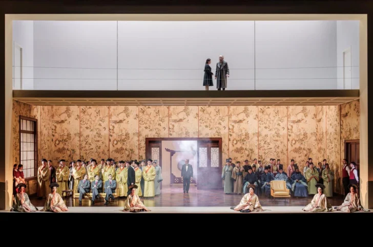 Lorsque résonnent les premières notes de l'opéra proprement dit, la jeune fille a grandi mais son comportement sanguinaire s'abat cette fois, et toujours sous le regard de tous, sur des hommes en chair et en os dont le corps la fascine et la panique tout à la fois. On apprendra au deuxième acte qu'elle a fait vœu de venger une aïeule violée dans les temps immémoriaux d'une Chine légendaire, un temps évanoui qu'elle recrée avec la complicité de ses frères et d'une domesticité aux ordres, se mettant elle-même dans la peau de son ancêtre au cours d'un rituel en tenues traditionnelles, réglé au cordeau, et conclu par l'exécution d'un homme. Christof Loy aime les intérieurs et sa Turandot ne déroge pas à la règle, celui de cette famille étant cette fois surmonté d'un couloir immaculé sur les murs duquel se détachent, comme des ombres passantes, les silhouettes de Liù, Timur et Calaf, progressivement absorbées par l'action se déroulant sous leurs pieds.