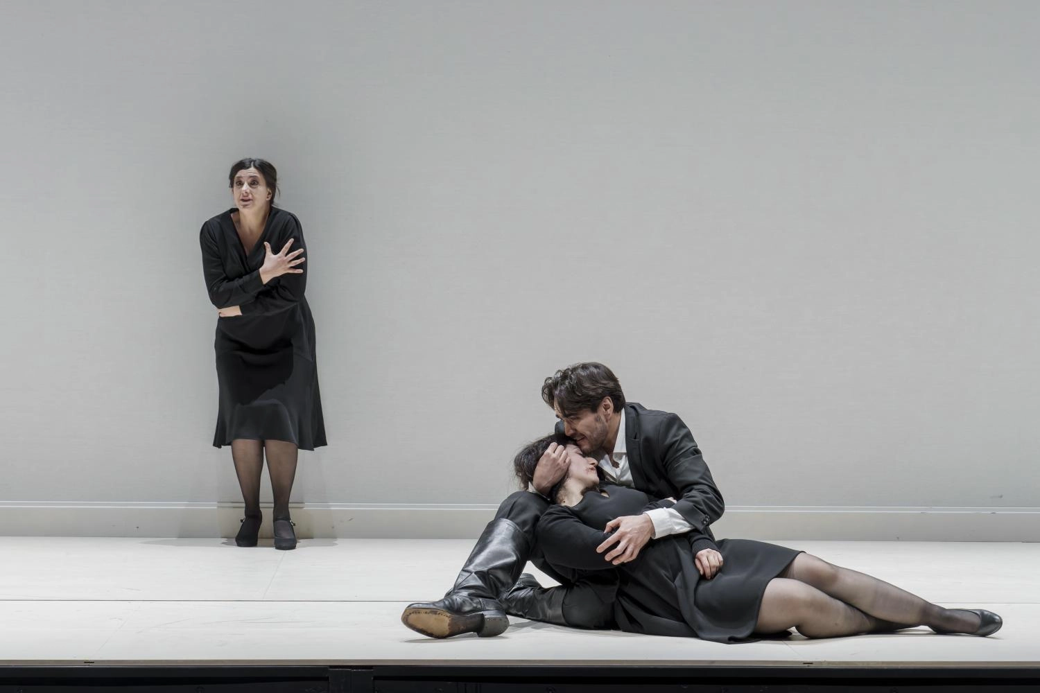 À l'instar de Toscanini, Loy a fait le choix de rappeler, après à la mort de Liù, que le compositeur s'est arrêté là. Mais au contraire du chef italien qui posa sa baguette, Loy ne pose pas son pinceau. Voici que le couloir qui surplombait spectaculairement l'action, et dont l'on se disait qu'il avait peut-être été sous-employé, s'abaisse vers le sol, repoussant vers l'arrière le palais de Turandot. Le finale se déroule dès lors devant un mur blanc faisant apparaître les personnages dans le plus simple appareil d'une vérité en noir et blanc. Après le suicide de Liù (bouleversants Parla ! Parla ! du chœur) devant une Turandot estomaquée par la violence du geste de la jeune femme, on comprend que le cours des choses va enfin basculer. Sourd alors de la fosse une autre partition de Puccini ! Composée 33 ans plus tôt, Manon Lescaut, son premier chef-d'œuvre, dont la musique de l'Acte IV, en reprenant les thèmes de Crisantemi, décrit providentiellement le désert émotionnel auquel est parvenu l'héroïne. Une double façon de boucler la boucle en démontrant au passage que, de son premier opéra à son dernier, Puccini était génial. Après le désolant constat de Sola perduta abbandonata, affranchie de son trauma, Turandot s'éteint enfin au côté de Liù. Même sobre robe noire pour les deux femmes semblant dès lors n'en faire plus qu'une. La fille d'Altoum ne connaîtra jamais l'amour, sinon ce que lui en aura appris l'amoureuse de Calaf. Calaf seul rescapé entre Altoum et Timur prostrés, et Ping, Pang, Pong en cariatides du malheur. Calaf qui aura tout perdu.