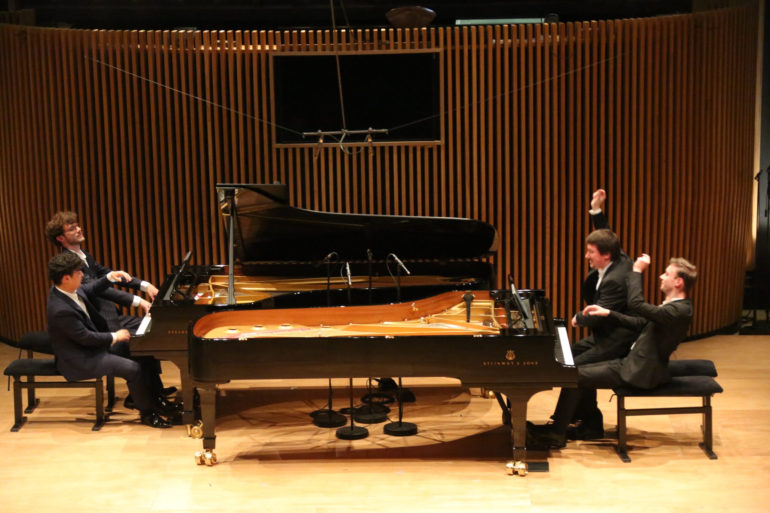 Quatre pianistes pour un seul concert, cela pourrait sembler beaucoup, alors pour les justifier, le programmateur Yves Petit de Voize leur propose de jouer un bis à huit mains sur deux pianos, défi relevé avec une belle transcription (anonyme) de la Marche Hongroise de Berlioz, tirée de la Damnation de Faust. Ici, difficile de juger qui joue le mieux, d'autant que en partie A du premier piano porte la plupart des thèmes, quand en partie A du second Steinway gère plus souvent les cloches. Mais dans les Trois Nocturnes, le jeu de ces deux pianistes se mêle à merveille, difficilement identifiable à l'un ou l'autre en fermant les yeux, tant le style et l'agencement se veulent cohérents. Superbement transcrits, les Nocturnes gardent dans cette version ravélienne pour deux pianos tous les particularismes de Debussy ainsi que ses atmosphères, très bien propagées par les jeunes artistes dans la Salle Élie de Brignac-Arqana, propriété du Groupe Barrière, mécène principal du Festival.