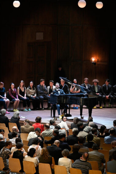 La direction d'acteurs est considérable, des petits riens parvenant à l'Acte I, à individualiser chacun des personnages, qu'ils soient maîtres ou apprentis, au bouleversant trio du III montrant un Walter ayant tout compris de la relation du passé amoureux d'Eva. Dans la peau de cette héroïne wagnérienne autrement plus agissante que d'ordinaire, Elena Tsallagova est, comme on peut l'imaginer, la séduction même : juvénile et fruitée, la voix s'amuse, s'émeut, gagne de l'ampleur et rayonne au-dessus du Quintette. Magdalena, toujours très secondaire dans ce monde principalement masculin, devient elle aussi un personnage de premier plan : en chef de chant du Conservatoire, la superbe vocale autant que le jeu (son hilarante direction des Silencium !) d'Annika Schlicht régalent. Dès la longue et redoutable leçon de chant de « son » David, énoncée à l'Acte I sans effort apparent, le très jeune Chance Jonas-O'Toole, fait figure de révélation du spectacle. Malgré une entrée trop présente au Quintette, Magnus Vigilius, comme son récent Siegfried à La Monnaie, est un Walter de premier ordre. Beckmesser des plus subtils, Philipp Jekal affiche une drôlerie consommée lorsque ses metteurs en scène ont la riche idée de l'installer au piano pour ses performances au luth, tant le contraste entre ce qu'on voit et entend (la petite harpe-luth chromatique dans la fosse) génère de second degré. Lui aussi présent à la création de ces Maîtres berlinois, Albert Pesendorfer se montre cette fois en excellente forme, à la tête d'un remarquable ensemble de maîtres. A-t'on envie de s'attarder sur le déficit de son (fatigue ? distraction ?), lors de sa joute avec Beckmesser au II, du Sachs de Thomas Johannes Mayer, le baryton allemand et son medium ému, soulevant partout ailleurs le plus vif intérêt ? Avant de bénéficier de la pléiade d'intentions de la réalisation tout au long d'un concours de chant finement distrayant, le chœur donne les frissons sur Wach auf. Comme à Bayreuth. Lui aussi grandiose et poétique, porté par Ulf Schirmer, l'Orchestre du Deutsche Oper n'est pas sans rappeler que c'est in loco que fut enregistrée la mythique version Jochum des Maîtres-chanteurs de Nuremberg.