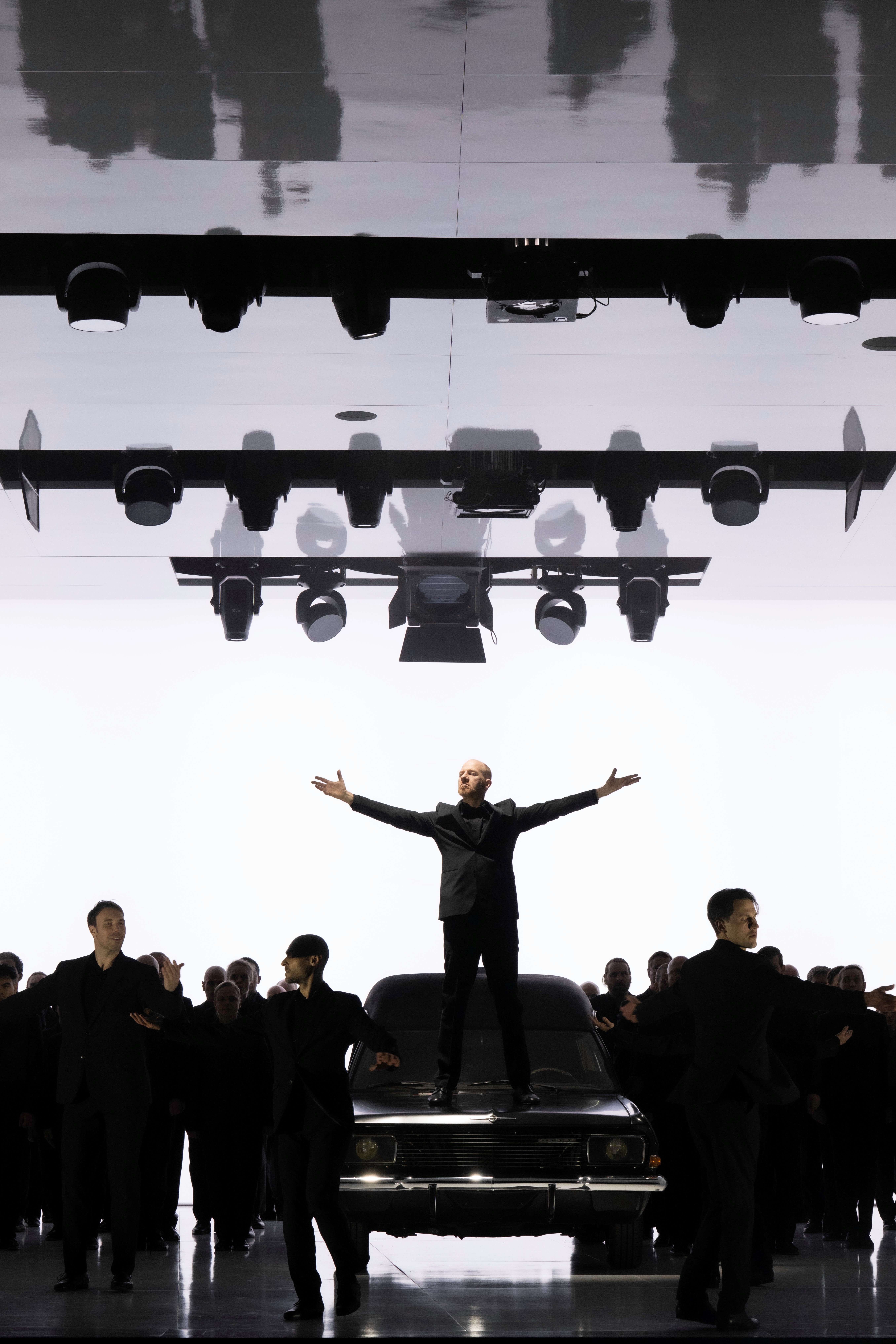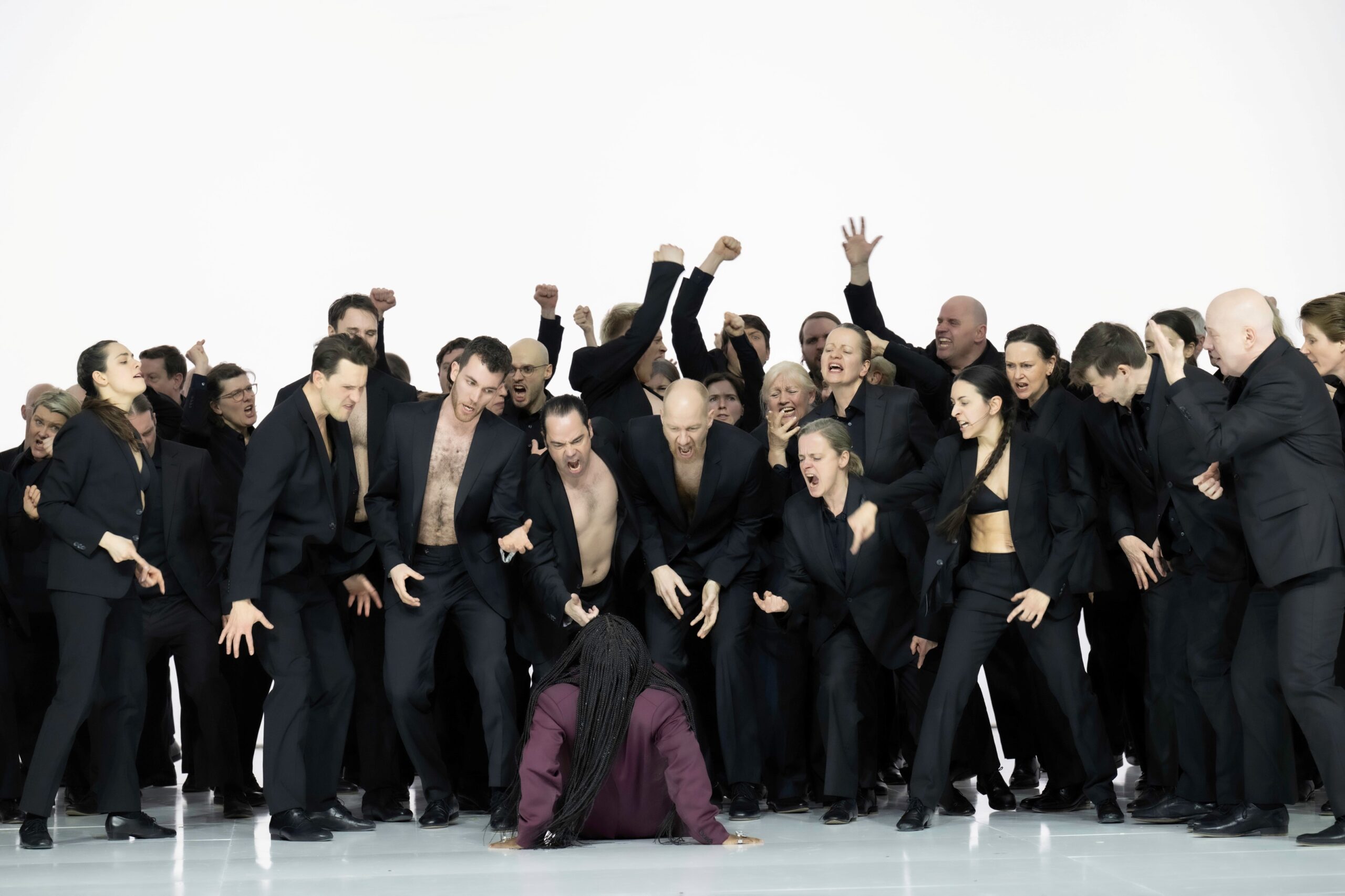 Tout aussi dépouillé, mais en total contraste, le second tableau, celui des funérailles d'Amenophis III, n'est pas moins saisissant : as de la direction d'acteurs, Barrie Kosky chorégraphie sans son fidèle Otto Pichler mais avec ses sept danseurs, une déploration des corps d'une énergie insensée (formidable interaction chœur/danseurs) autour d'un corbillard égaré dans le brouillard. Délaissant la quincaillerie égyptienne qui embaumait les pionnières productions de Phelim McDermott pour le Met, comme celle de Mary Zimmermann pour Strasbourg, la scénographie se déploie dans le vide géométrique d'un espace mental au sol mouvant (large tournette), aux parois et au sol réfléchissants percé de deux portes latérales, de trouées au plafond laissant choir une armada sophistiquée de projecteurs, ou une collection de sphères lumineuses. Armé de l'autorité d'un jeu d'orgue agrémenté de fascinants effets de style « couloir du temps » ou pixelisant ses personnages, Barrie Kosky épouse le scénario d'un opéra qui n'en a pas vraiment, articulé, comme l'on sait, autour d'une succession de moments-phares de la vie d'un pharaon généralement réduit à trois fondamentaux : fondateur du monothéisme (le culte d'Aton), androgynie, époux de Néfertiti. De ce cocktail détonnant, Kosky fait malicieusement son miel. Avec presque rien : quelques nuages noirs pour les funérailles, une baudruche grossissante de matière noire pour la destruction du Temple d'Amon, une garde-robe faisant le yoyo entre le masculin et le féminin pour le rôle-titre, un énigmatique duo Akhnaten/Nefertiti, une immense robe noire pour un Hymne au soleil crépusculaire… En n'omettant pas au passage de régler son compte à la meute humaine, capable de brûler ce qu'elle a adoré. D'une simplicité simplissime, un spectacle sublime qui, tout en suivant l'œuvre au plus près de sa vérité, donne aussi la sienne.