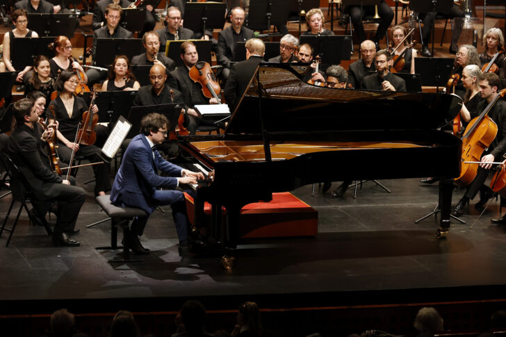 Le concerto pour piano de Gershwin porte la signature d'un compositeur qui a su combiner des structures de musique classique et du jazz. Après une entame sans relief, un deuxième concert semble débuter dès l'entrée fort à propos du pianiste Lucas Debargue. Et ce qui suit est de bout en bout irrésistible, nourri par une complicité entre Ludovic Morlot et les musiciens espagnols. Le rythme du charleston et sa pulsation rapide créent un dialogue animé entre l'orchestre et le piano. Lucas Debargue a choisi un modèle Stephen Paulello à la place du traditionnel Steinway ou Yamaha et ses parties solo laissent apprécier son aisance digitale. La spontanéité de son approche trouve un relâchement inspirant. Il pénètre ainsi l'essence de cette musique et la fait vibrer. La sonorité vibrante des cordes, la sensualité des bois, et ce swing de part et d'autre nous entraînent dans un voyage musical aussi jubilatoire que sensible, au cœur de l'histoire des Etats-Unis. Une fenêtre ouverte sur la jeunesse américaine avec son enthousiasme, ses rêves et ses aspirations. Le mouvement central évoque, quant à lui, le blues américain ce que les formidables solistes – notamment à la trompette et à l'hautbois – ne manquent pas de mettre en lumière : des harmonies qui nous rappellent l'esprit du club de jazz, là où les sets s'enchaînent et se prolongent tard dans la nuit. Enfin, directement enchaîné avec l'épisode précédent, l'Allegro agitato ne laisse aucun répit aux interprètes, et l'expression résonne avec une grande modernité. L'amplitude des lignes, le groove du soliste sont autant d'éléments enthousiasmants malgré un orchestre qui couvre le piano en toute fin de mouvement. Lucas Debargue revient offrir un bis, une remarquable improvisation sur le thème de Summertime.