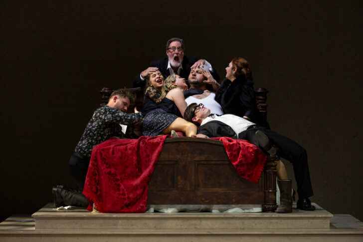 Gianni Schicchi respecte tous les ressorts de la farce et de la comédie, menée tambour battant par l'imposant et rusé Misha Kiria au timbre sombre et percutant face à une famille Donati veule et cupide dans laquelle la Zita de Enkeledja Shkoza en matriarche autoritaire et le Betto de Manuel Esteve Madrid mènent la rébellion face à l'inique testament, entourés de la pimpante Theresa Kronthaler ( La Ciesca) et de tous les autres comprimari portés par une direction d'acteurs qui joue habilement de la dynamique collective. Si le ténor Alexey Neklyudov (Rinuccio) manque quelque peu de projection dans les ensembles, son timbre fait valoir toute sa douceur dans son duo d'amour final avec Lauretta. Asmik Grigorian (Lauretta) ne fait dans ce premier épisode qu'une apparition assez fugace, pleine de fraicheur, nous gratifiant d'un émouvant « O mio babbino Caro » à faire pleurer les pierres qui met d'emblée Bastille à ses genoux.