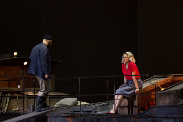 Changement radical de climat avec Il Tabbarro, drame vériste, noyé dans la pénombre miséreuse et sans espoir des quais de Seine rappelant l'atmosphère brumeuse des films noirs, entretenue par un orchestre aux couleurs tendues par le drame, l'adultère et la jalousie. Patron de la péniche, miné par la jalousie, Roman Budenko incarne un Michele désabusé au baryton sombre et ample dont la violence contenue se libère dans des aigus bien projetés. Face à lui Joshua Guerrero (récent Don Carlo à Vienne) oppose un chant brûlant de passion dont le timbre s'acidifie quelque peu dans l'aigu, tandis qu'Asmik Grigorian campe une Giorgetta à la fois sensuelle et résignée, usée et formidablement humaine, dont le timbre rond, le souffle infini et le sublime legato nous font rendre les armes. Parmi les comprimari, on retiendra l'inénarrable Frugula de Enkeledja Shkoza, entourée des personnages pittoresques de Scott Wilde (Il Talpa) et Andrea Giovannini (Il Tinca).