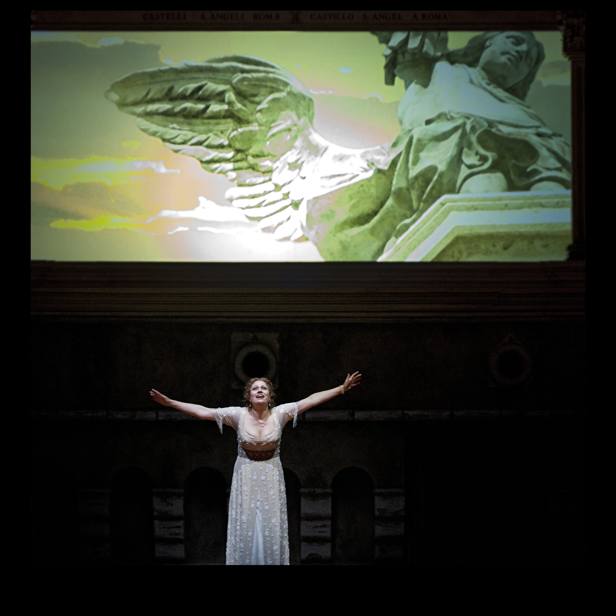 « Les événements décrits dans Tosca se sont produits en 1800. Exactement cent ans plus tard Puccini écrivait Tosca. » Tracées sur l'écran qui surplombe la pièce maîtresse du décor de la Tosca d'Alvis Hermanis, ces quelques didascalies « méta », à l'orée du spectacle, semblent annoncer une revisitation d'un des opéras les plus populaires du répertoire : Angelotti, par exemple, avant d'être un comprimario d'opéra, fut effectivement prisonnier politique après avoir été Consul de la République romaine installée en 1798 par Bonaparte. Cet écran occupe une place non négligeable dans la scénographie de cette Tosca créée en 2014, mais qui fait plus que son âge, la réalisation du metteur en scène letton ressemblant à celles qu'on pouvait voir partout jusque avant les années 70… Dans la foulée de ce préambule historique, le décor (quasi-unique pour les trois actes) avait prévu de déléguer au susdit écran le soin de montrer les lieux et les états d'âme de l'action par le biais de peintures (d'un sommaire assez redoutable à en juger sur les photos de presse). L'Acte I tourne autour du portrait de la Madone en chantier, non sans quelque appréhension, la vidéo se mettant à dysfonctionner assez vite, condamnant l'écran à rester bloqué sur la production de Cavaradossi : ce qui peut se justifier à l'Acte I fait office de véritable trou noir pendant les Actes II et III, abandonnés à la vacuité de la mise en scène par cet écran géant désespérément muet.