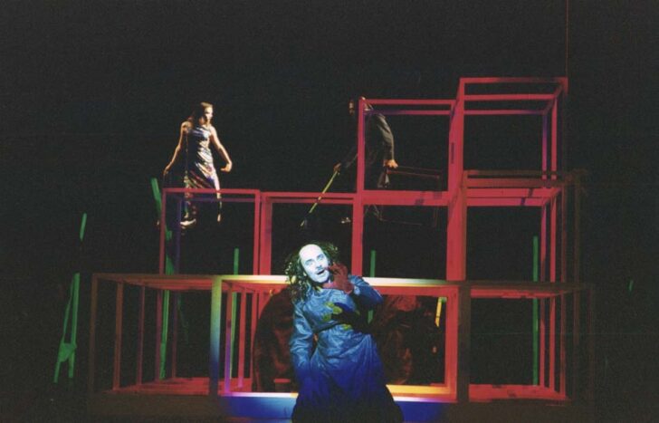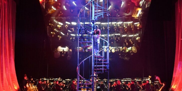 Schoenberg études pour la première scène de die Glücklische hand, 1910 © center Wien ; Patrick Simper dans le rôle de l'Homme, die Glûcklishe hand © Saarbrucken oper 2001 ; Tomasz Kaluzny chantant die Glücklische hand sur un escalier en colimaçon « atteignant le ciel », opéra de Ulm 2018 © Jochen Klenk