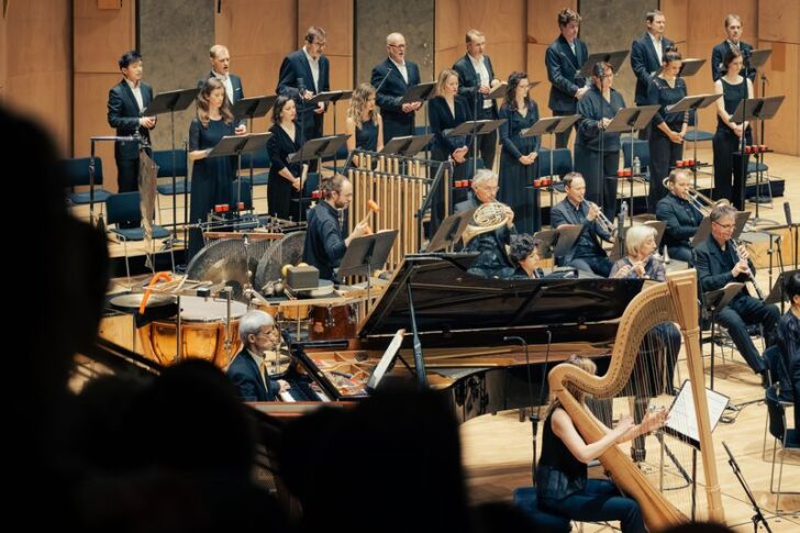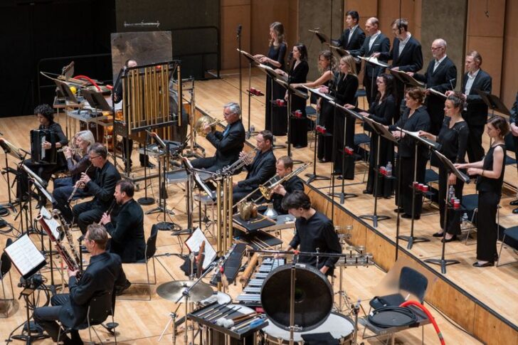 Emmenée par Léo Warynski qui connait bien la musique de l'Italien pour l'avoir dirigée maintes fois, la soirée conjugue les forces de l'Ensemble intercontemporain et des Métaboles dans un programme somptueux où les quatre pièces d'une première partie totalement immersive (sans changement de plateau ni applaudissements) font alterner musique instrumentale et ensemble vocal.