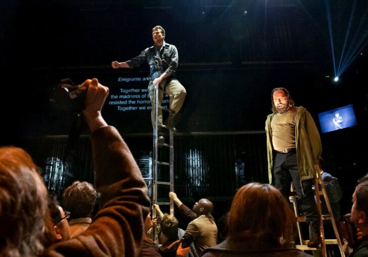 Particulièrement bien pensée, la production de Benedikt von Peter, dans les éléments de décors de Katrin Wittig et costumes de Geraldine Arnold, affiche régulièrement des têtes sur les murs (vidéos de Bert Zander), comme pour rappeler les disparitions de nombreux hommes et femmes alors qu'ils tentaient d'accéder à une vie meilleure. On pourrait alors tenter pour notre part d'aborder cette représentation comme une simple prestation lyrique, pour mieux apprécier l'aigu tendu de Peter Tantsits dans le rôle principal, ou citer la vigueur de la soprano Lisa Mostin dans le rôle de sa compagne. Mais on préfère se focaliser sur la force de ce spectacle, finalement juste amenuisé par les conventionnels applaudissements – très nourris – aux saluts, alors qu'il y aurait eu encore plus d'impact à laisser ressortir le public comme il était entré, sans le ramener à sa condition bourgeoise de simple auditeur.