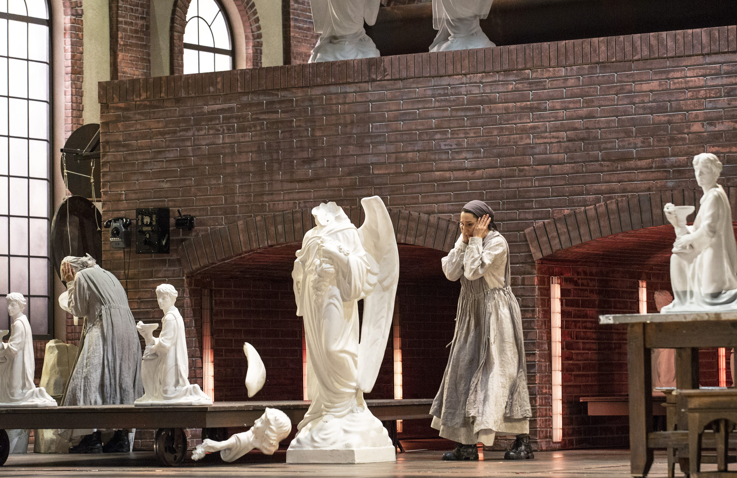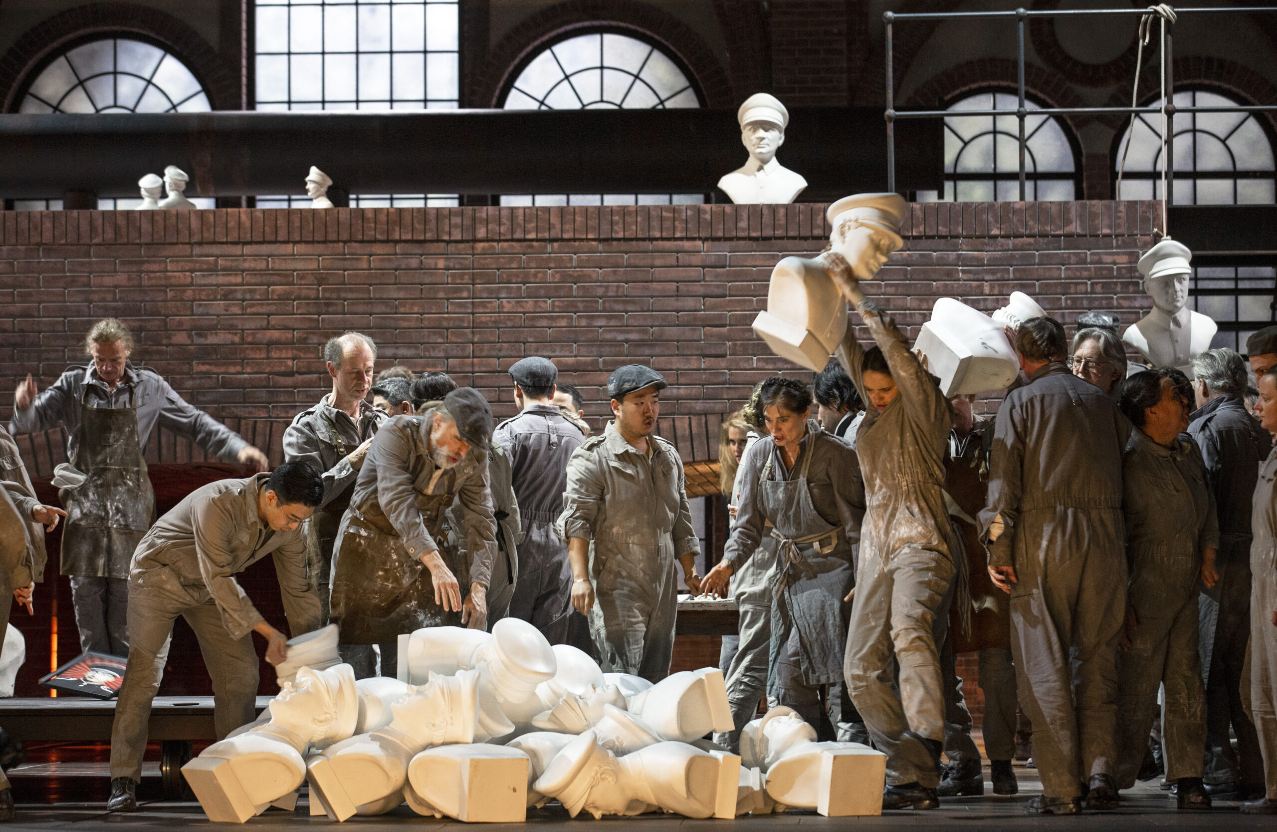 La forêt d'Irminsul a vécu, remplacée ici par une manufacture ensoleillée où, pendant l'entrée du public, s'activent longuement d'industrieuses religieuses autour de la confection de pieuses statues. Un labeur contrarié à l'heure dite du spectacle par le grondement menaçant d'une rumeur urbaine qui n'est pas sans rappeler certain Acte II de Dialogues des carmélites. Explosion: la fiévreuse Ouverture de l'opéra décrit alors l'intrusion de la soldatesque et du cortège de clichés y afférents, brutalité, viols en série… Le rideau tombe pour se relever une dizaine d'années plus tard sur une tout autre atmosphère : le lieu, sous haute surveillance, est cette fois entièrement dédié à la confection d'une seule et unique statue, celle du dictateur en place, dont le portrait avait été déroulé dès l'irruption militaire. Orovese est le délégué syndical d'un nouveau prolétariat ployant sous le joug et entré en résistance. Norma est la passionnaria de l'usine, « casta diva » qui, comme tant de femmes (et hommes) de tête en pareil cas, semble avoir sacrifié sa vie intime pour la Cause. C'est à elle que revient le rituel de la commémoration du jour funeste, autour des reliefs dorénavant vénérés d'une statue jadis brisée par la violence révolutionnaire. Seul le spectateur connaît le secret de cette chaste officiante : depuis qu'elle a cédé au premier regard au charme de l'homme qui a conduit la révolution dans son usine, elle élève les deux enfants nés de sa relation avec lui, l'ennemi du peuple. Une décennie de mensonges, ce qui n'est pas une mince affaire dans la Kommunalka où elle vit, épiée par tous ses voisins. Barkhatov fait mouche là aussi en rappelant à notre époque où il arrive que la censure advienne, non du Pouvoir, mais de vos amis d'hier, bref, comme l'avait si bien exprimé le philosophe, que l'enfer c'est les autres… Les scènes d'intimité sont réglés avec un sens remarquable du suspense (réactions des voisins de Norma, mais aussi de ses enfants, forcément mêlés aux affres sentimentaux de leur mère) et même, c'est assez inédit, de l'humour (l'apparition de Pollione à la fin du premier duo Norma/Adalgisa), dans une scénographie séduisante avec son alternance de scènes plein cadre à l'usine et de scènes plus resserrées dans la Kommunalka.