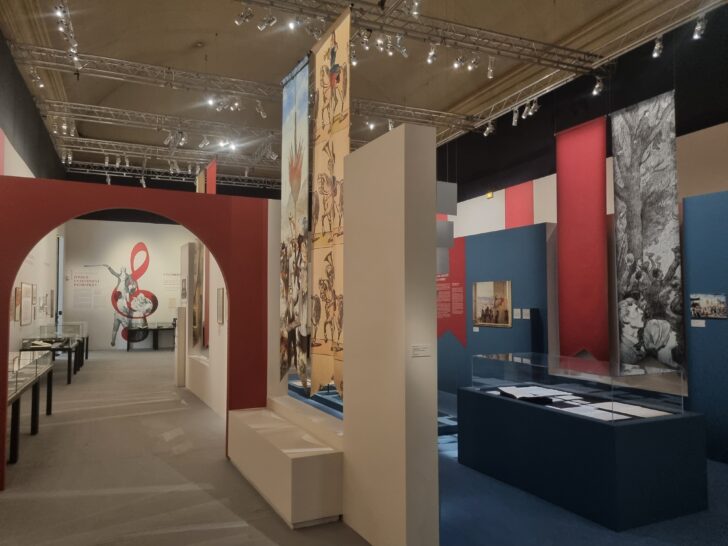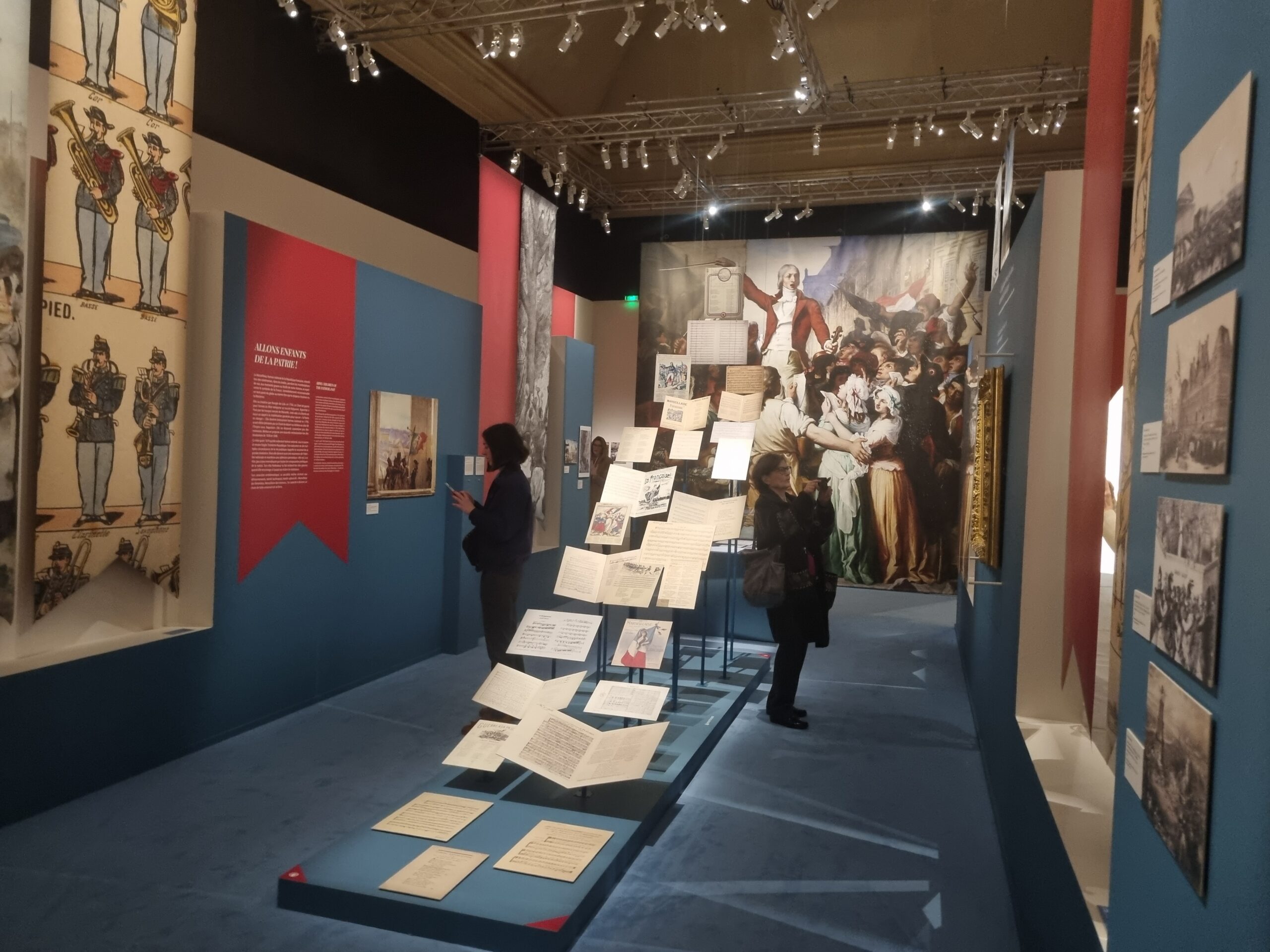 La scénographie, à dominante bleu et rouge, est habilement conçue pour faire cheminer les visiteurs dans un très grand espace et avec autant de documents, tout en maintenant l'intérêt. Car le parcours est imposant, découpé en trois parties : la Révolution, la réorganisation de la formation musicale et la musique engagée.