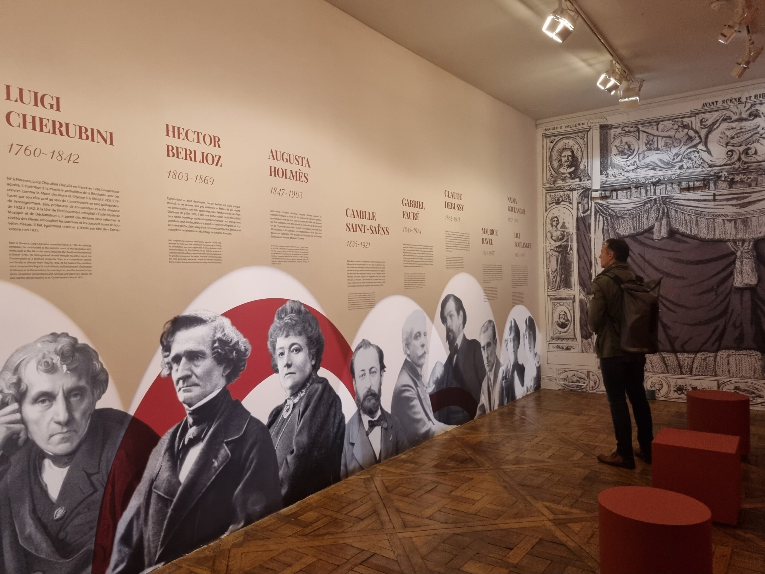 Dans un dernier espace à la façon d'un petit théâtre, une grande frise de compositeurs et compositrices se déploie avec les apports de chacun(e) à cette période de grands changements pour la musique, accompagnés sur le mur d'en face de nombreuses citations. Berlioz bien sûr arrange La Marseillaise pour orchestre en 1830, Augusta Holmès compose une Ode triomphale pour commémorer le centenaire de la Révolution en 1889, Gabriel Fauré dirige le Conservatoire pendant la Première Guerre mondiale, Ravel écrit le Concerto pour la main gauche pour le pianiste autrichien Paul Wittgenstein qui a perdu son bras droit au combat…Diffusés dans cette salle, plusieurs extraits de chansons françaises populaires dont Le temps des cerises qui date de 1866-68, démontrent que la chanson et la musique, pas seulement politiques, créent du lien par delà les générations.