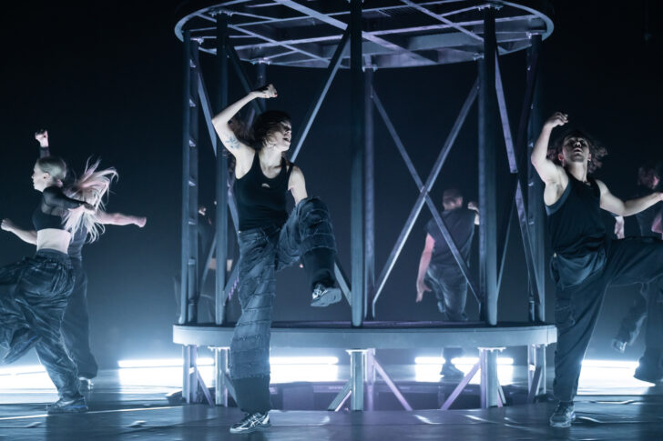 Une tour métallique sur deux étages. Des danseurs qui sortent un par un du public réparti debout tout autour de cette scène, puis s'installent à égale distance sur les bords du plateau métallique, face au public. D'un coup, les huit danseurs passent de l'immobilité à des rebonds synchronisés. Une fois ce mouvement installé, les têtes tournent, toujours ensemble, les bras se lèvent. Et puis le rythme de la musique électro de Lucie Antunes s'accélère jusqu'à une cadence folle tandis que les mouvements se complexifient.
