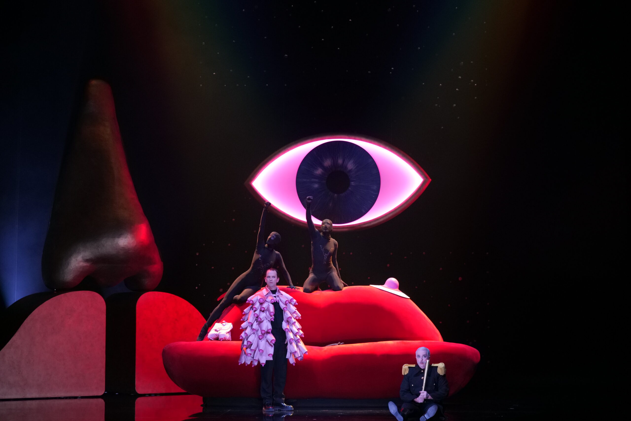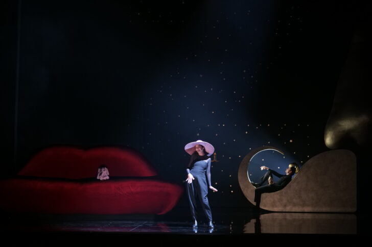 Avec panache en effet car la mise en scène proposée par le contre-ténor Théophile Alexandre ne manque pas d'élégance. L'esthétique de music-hall aux éléments de décors et de costumes symboliques sert d'écrin au texte surréaliste d'Apollinaire. L'on y retrouve le canapé-bouche de Dali, une cape de mamelles que la femme refile à l'homme, les jupes bananes de Joséphine Baker, des yeux suspendus… Il faut dire que la musique de Poulenc était une invitation à ce ballet grotesque et un peu « bordélique » (tant sur le visuel que les mots), alternant la fantaisie et les langueurs avec toujours en ligne de mire une réflexion sur les normes sociales. On rit beaucoup de la place des personnages, puis on s'interroge de ce rire et de ce qu'il recouvre. Telle est la force de ce livret et de cette musique où le pétillement et le lyrisme se succèdent, le tout accompagné d'une prosodie redoutable à assumer pour les chanteurs.