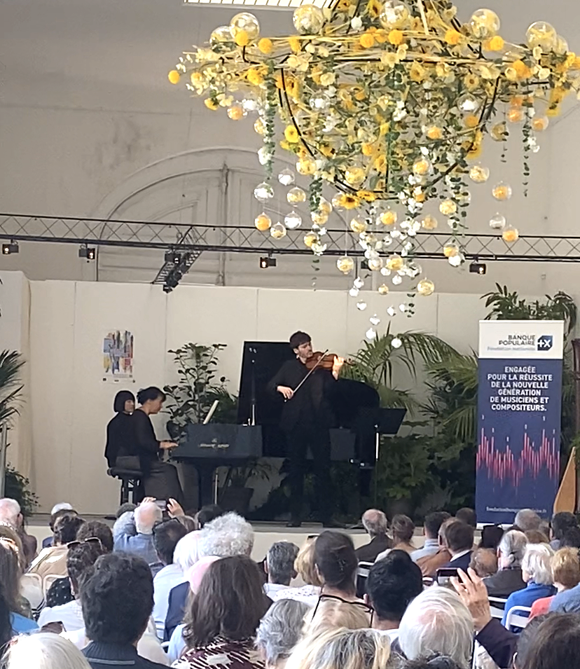 Ces études ont donc offert une très bonne transition vers le second concert : une carte blanche à Marie-Josèphe Jude. Récemment nommée au jury de la Fondation Banque populaire, la pianiste s'est entourée du violiniste Vassily Chmykov et du Quatuor Agate pour un programme réunissant Debussy, Ravel et Brahms. Vassily Chymkov livre une version très personnelle de la Sonate pour violon et piano de Debussy, axée sur le vibrato et la densité sonore aux interprétations privilégiant la transparence de cette œuvre sombre et mélancolique. Attentive à son partenaire, Marie-Josèphe Jude accompagne le violon tout en sérénité et force tranquille. La réunion de ces deux tempéraments différents mais complémentaires trouve son apogée dans le célèbre Tzigane de Maurice Ravel. Vassily Chmykov peut déployer toute sa sonorité et sa virtuosité dans la très belle cadence initiale. Plein de fougue, parfois un tout petit peu brouillon, le violoniste s'approprie parfaitement le style esbrouffe-libre de la pièce. Lorsque le piano rentre enfin et que l'écriture se fait plus normée, les deux interprètes mènent avec fluidité le changement de style de la pièce. Marie-Josèphe Jude s'associe ensuite au Quatuor Agate pour deux mouvements du quintette de Brahms. Là encore, la pédagogue, professeure au CNSMD de Paris, sait porter ses partenaires et être à leur écoute. Les quatre musiciens du quatuor montrent un bel engagement musical, respirant ensemble dans des gestes presque théâtraux. Le Scherzo est superbe, tout comme le Finale qui souffre un peu malheureusement de l'acoustique de la salle. On aurait bien écouté le quintette dans son intégralité !