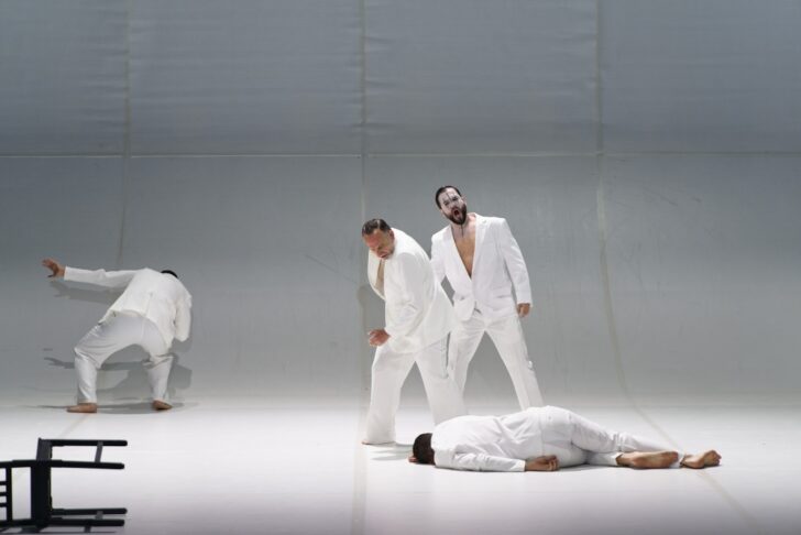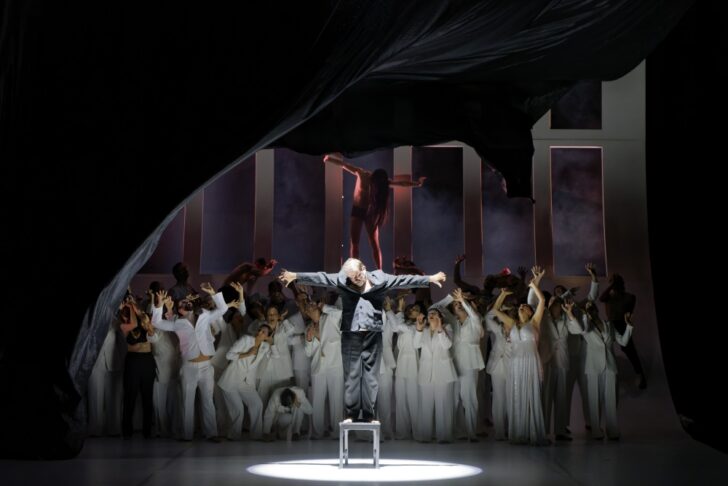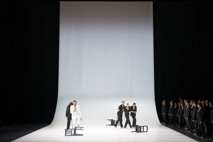 Feuille froissée par la vidéo écrite à l'encre noire, feuille vierge meublée d'armoires aux fantasmes, circonscrite pour les intérieurs de l'Acte II, ou percée de fenêtres pour la prison et le temple au III, mais le plus souvent immaculée, sur laquelle « le duel à trois » se joue au scalpel. Costumes noirs pour les gentils (Hébreux), blancs pour les méchants (Philistins) : voilà qui nous change… Une armada de clones de Dalila incarnée par dix danseurs des deux sexes apporte le mouvement qui pourrait faire défaut à un concept faisant fi de tout accessoire, une poignée de chaises et un masque d'escrimeur exceptés. Le concept est parfaitement en osmose avec l'ambition initiale de Saint-Saëns de composer un oratorio à partir du livret que Voltaire avait écrit pour Rameau en vue d'un Samson qui ne vit jamais le jour (même si reconstitué en 2024 par Claus Guth et Raphaël Pichon à Aix), et qui ne discrédite en rien une réalisation esthétique et spectaculaire, jusqu'à un écroulement final du Temple de Dagon absolument convaincant.