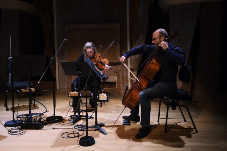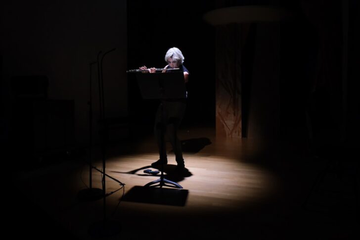 Éclairée à jardin, la violoniste Hae Sun Kang donne en création mondiale Into the Shades, une pièce de la Slovène Nina Šenk qui lui est dédiée. Le solo est tiré du troisième concerto pour violon de la compositrice. On est d'emblée frappé par la dimension chorégraphique de la ligne dessinée par le violon voyageant avec souplesse du grave aux aigus stratosphériques de l'instrument. Des glissements sensuels relâchent parfois la tension, Hae Sun Kang et son superbe violon épousant la trajectoire expressive avec une élégance et un raffinement du timbre qui font merveille. À cour, c'est l'alto d'Odile Auboin qui prend le relai avec Mitsein – Preludio, la deuxième création de la soirée de la compositrice italienne Manuela Guerra, élève de Michael Jarrell et diplômée en 2022 de la HEM de Genève. Sur la voie du spectralisme, la pièce joue sur deux registres, les fondamentales graves de l'instrument, sondées avec vigueur par l'altiste, et la richesse des partiels tout en dentelle et délicatesse qui en résultent, Odile Auboin – à qui la pièce est dédiée – nuançant à l'envi les couleurs qu'elle tire de son alto.