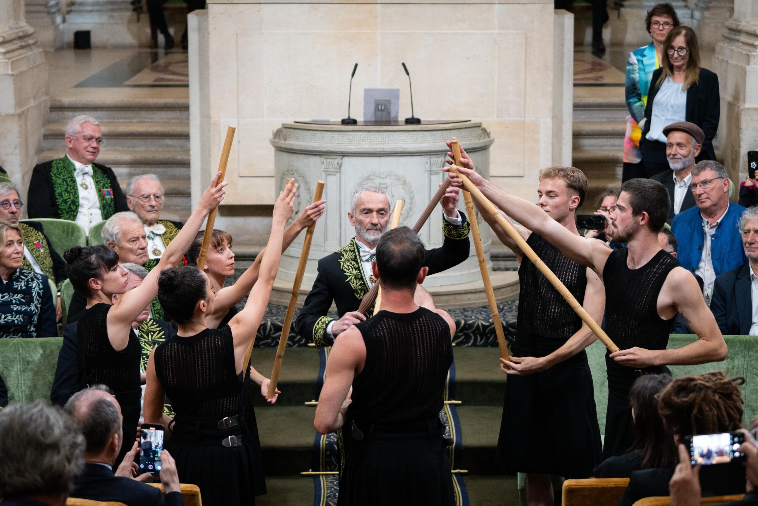 Moment solennel : la remise de l'épée d'académicien, conçue par la designer Constance Guisset, qui a conçu la scénographie de plusieurs de ses spectacles, par Nicole Saïd. L'épée, pensée comme un bâton de pluie et de combat, est sertie d'un disque de météorite et taillée dans du noyer à croissance lente, pour sa densité sonore. Elle symbolise à merveille cette alliance entre douceur et puissance qui traverse toute l'œuvre de Preljocaj. Des extraits de spectacles dansés par le Ballet Preljocaj sont venus ponctuer la cérémonie, tissant un lien vivant entre les livres, les mots et les corps.