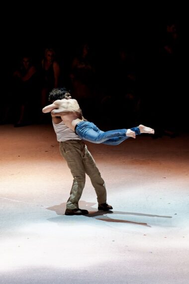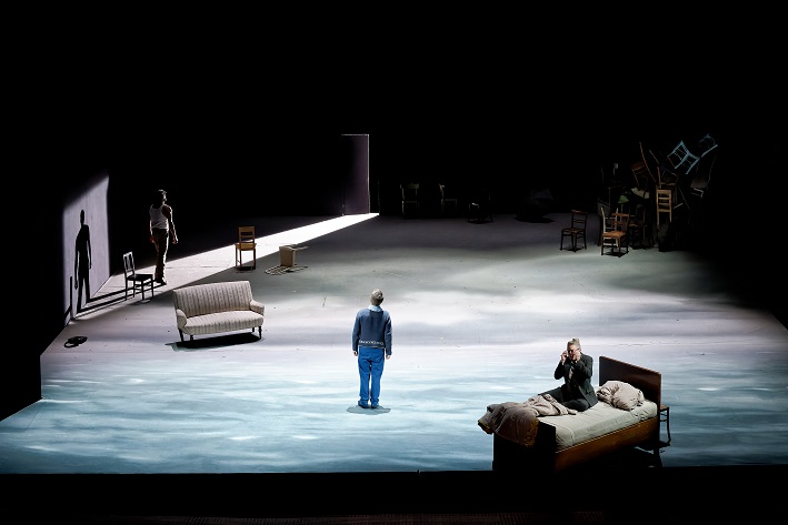 Pas davantage de pittoresque dans le décor, d'une audacieuse nudité : un sol brouillant la frontière entre terre et mer et qui donne l'impression que les personnages sont égarés dans un cosmos maritimo-céleste, un mobilier à l'os autour d'un lit sortant lui aussi du cadre, incliné dangereusement vers la fosse, et auquel on reviendra sans cesse. Comme ce très signifiant point focal, tous les personnages semblent en déséquilibre, au bord de la bascule, comme à la fin du Requiem de Castellucci. Mais c'est vers un autre effet, presque aussi spectaculaire, que ce décor sans échappatoire touristique tend à la fin, quand l'obscurité qui le ceignait depuis plus de deux heures se voit enfin déchirée par un rai de lumière offrant au héros la perspective d'une échappée belle à la manière de Truman dans le film de Peter Weir The Truman Show. Effet d'une simplissime simplicité. Mais très grand moment d'opéra.