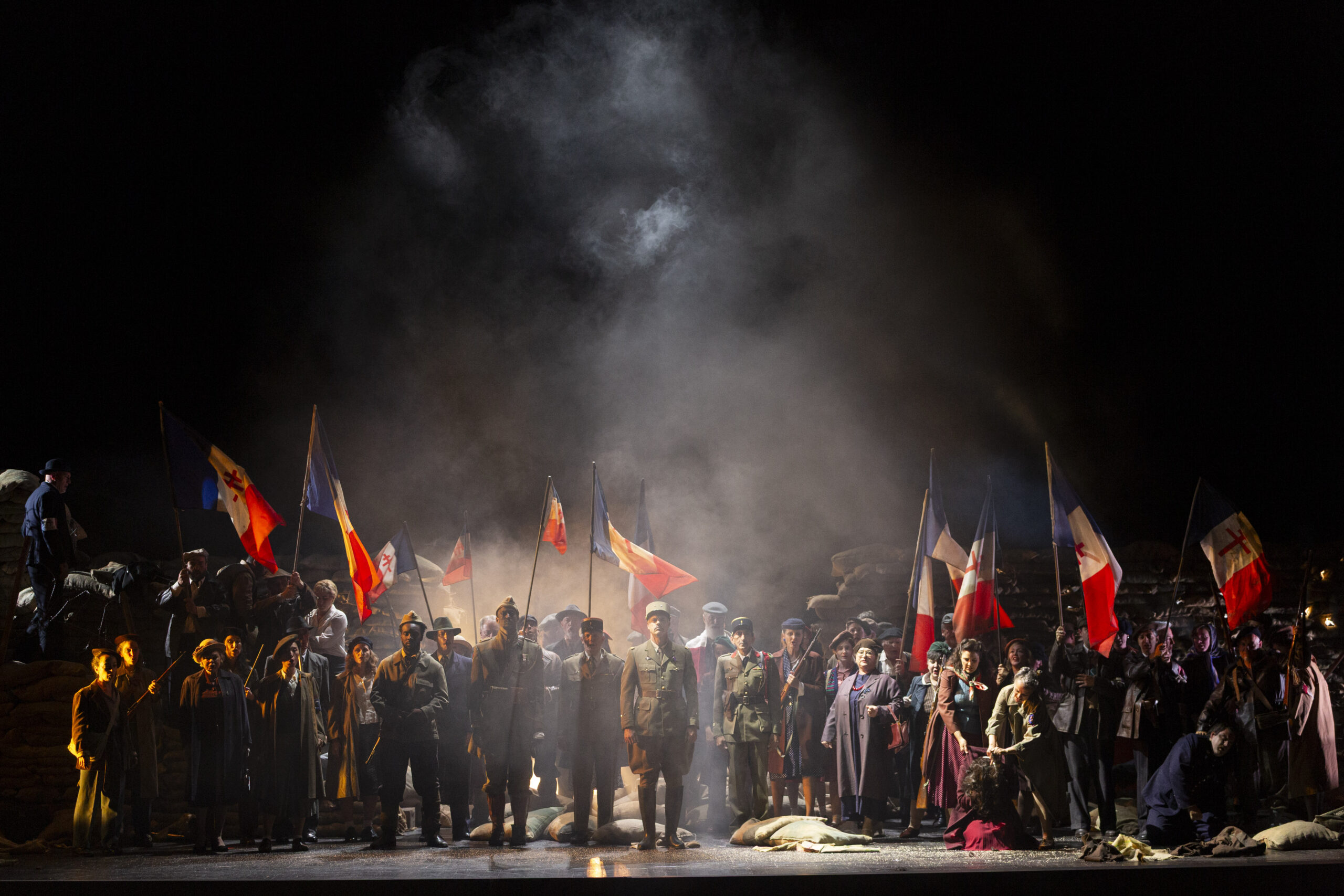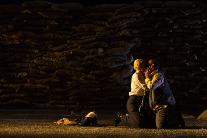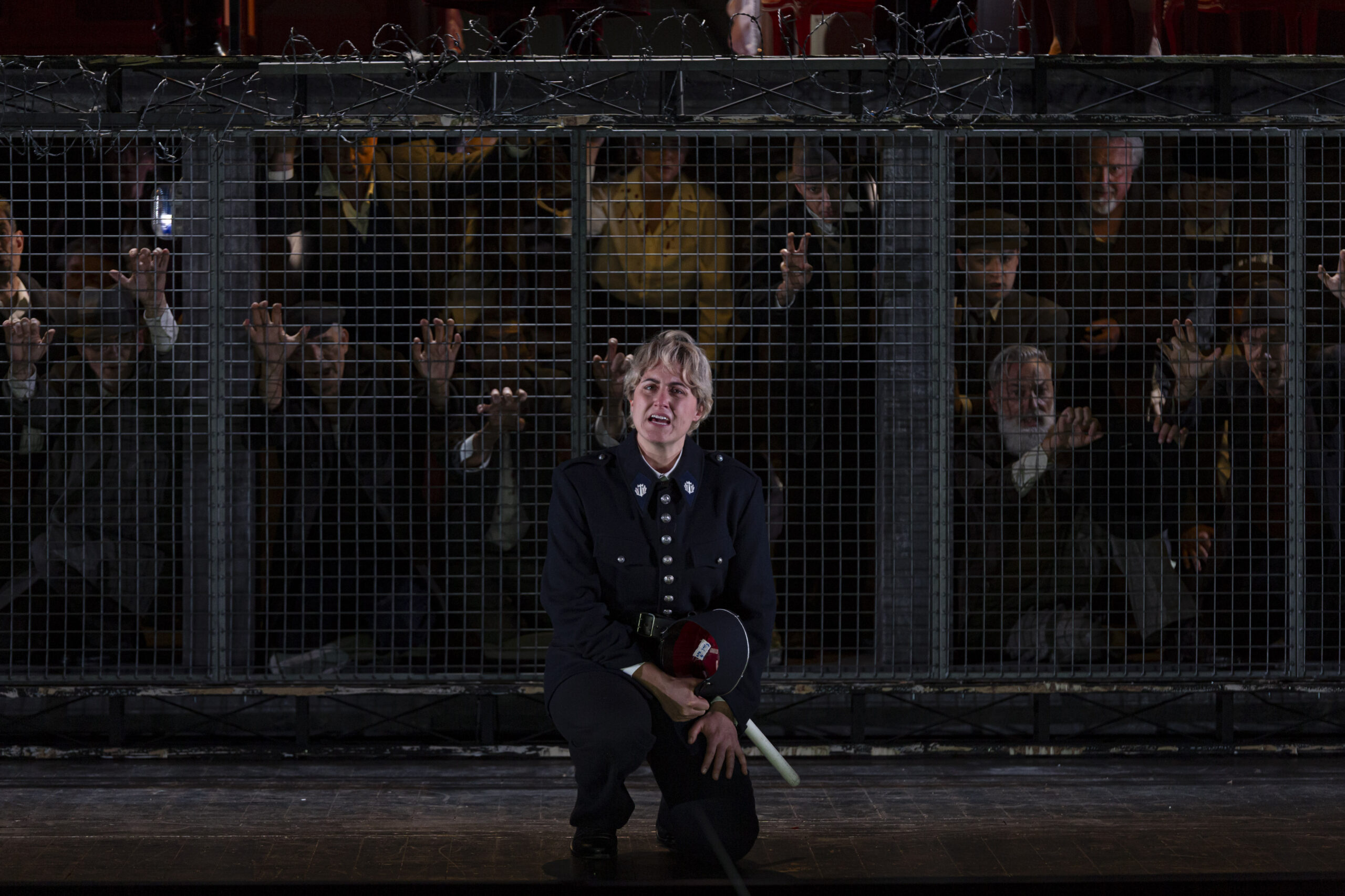 En revanche, sous la baguette de Joseph Swensen, son bouillonnant nouveau chef, l'Orchestre National Bordeaux Aquitaine déçoit par un rendu certes robuste mais aux sonorités brouillonnes, avec des cordes peu séduisantes, un cor qui se chauffe encore, des bois manquant de transparence, des timbales systématiquement noyées dans la masse. Lumineuse Léonore, Jacquelyn Wagner ne semble pas tout aussi à l'aise dans les dernières mesures du redoutable Abscheulicher!, qu'à l'Opéra Comique en 2021. Passé un Gott ! initial murmuré dont le crescendo semble ne jamais devoir advenir, on s'attache progressivement à l'émouvant Florestan de Jamez McCorkle. C'est au fil de la représentation que Szymon Mechliński trouve la pleine noirceur de Pizarro : Er sterbe! impressionne davantage que Ha! Welch ein Augenblick! Le Rocco de Paul Gay est tout à fait correct, secondé par le Jacquino de Kévin Amiel, bien servile mais pas toujours audible. Méritant tous les éloges, la Marzelline de Polina Shabunina assure avec un bel aplomb son beau personnage de femme pour qui le mariage n'est pas un parcours obligé. En Fernando-De Gaulle-Leclerc, Thomas Dear manque légèrement d'autorité. Les deux prisonniers rendent justice aux deux magnifiques phrases que Beethoven leur a dédiées. Le chœur conduit à bon port la galvanisante scène finale, introduite par le franchissement spectaculaire d'une barricade de sacs renversés, suivie d'une avancée à la rampe, très « La Liberté guidant le Peuple ».