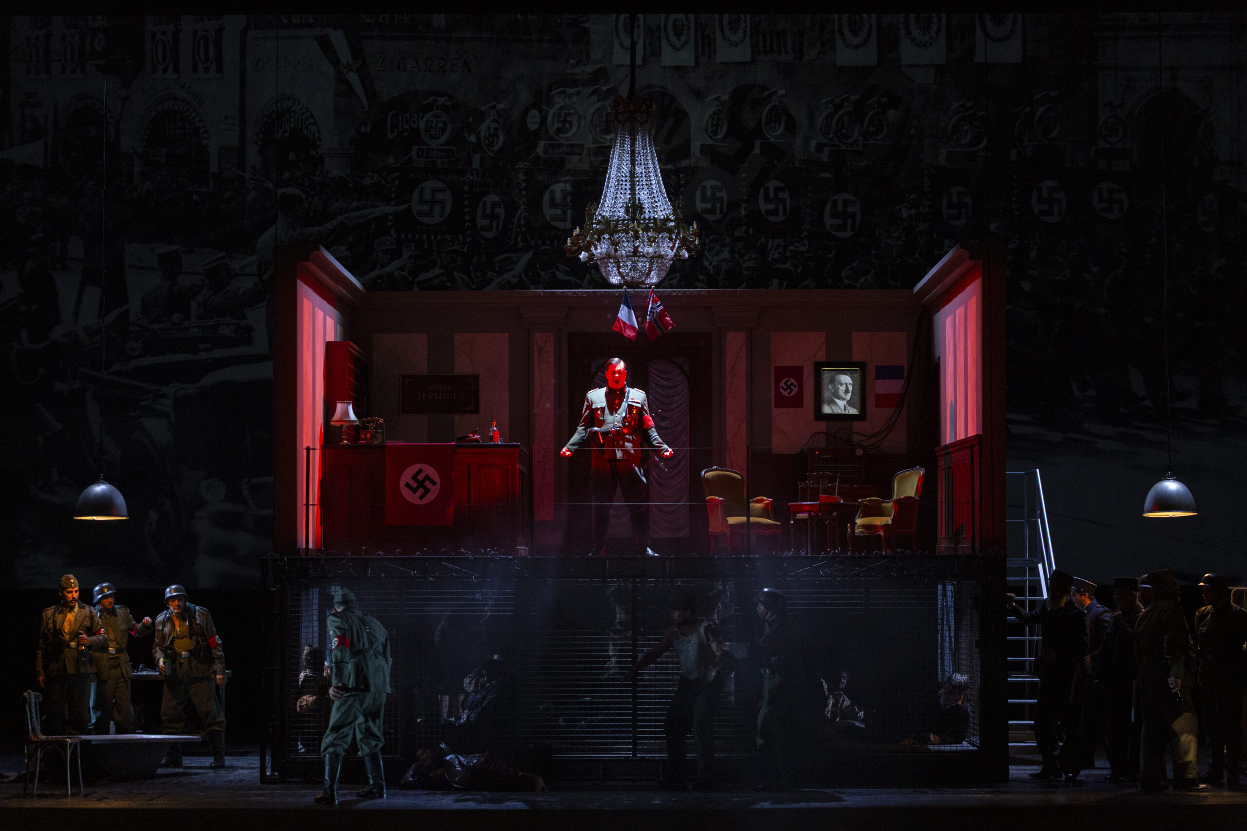 Valentina Carrasco s'était déjà penchée sur le cas Mao Zedong à l'occasion de ses débuts à l'Opéra de Paris conjugués avec ceux du Nixon in China de John Adams. C'est le tour d'Hitler cette fois, avec un Fidelio que le curseur temporel de la mise en scène place sous l'Occupation. Une période sombre dont le souvenir des exactions est encore si vif que la maison bordelaise a cru bon d'avertir en amont : « certaines scènes ou éléments historiques sont susceptibles de heurter la sensibilité des spectateurs. » Valentina Carrasco ne s'encombre effectivement pas de faux-semblants, montrant dès un Acte I au décor exhibant crânement à son étage supérieur, dans un hall d'hôtel réquisitionné par la Gestapo, un portrait de Hitler, un Pizarro qui valide la hargne de son premier air par un salut nazi, des croix gammées et, au sous-sol, des scènes de tortures à répétition : un procédé qu'elle avait déjà efficacement utilisé en faisant se soulever le plateau de Bastille pour révéler le hiatus entre les échanges policés de Nixon et de Mao et la brutalité de la police d'état. A Bordeaux les deux décors sont montrés simultanément : l'œil est donc toujours sollicité face au contrepoint productif des deux images.