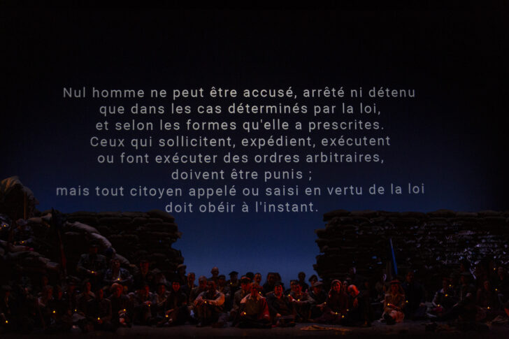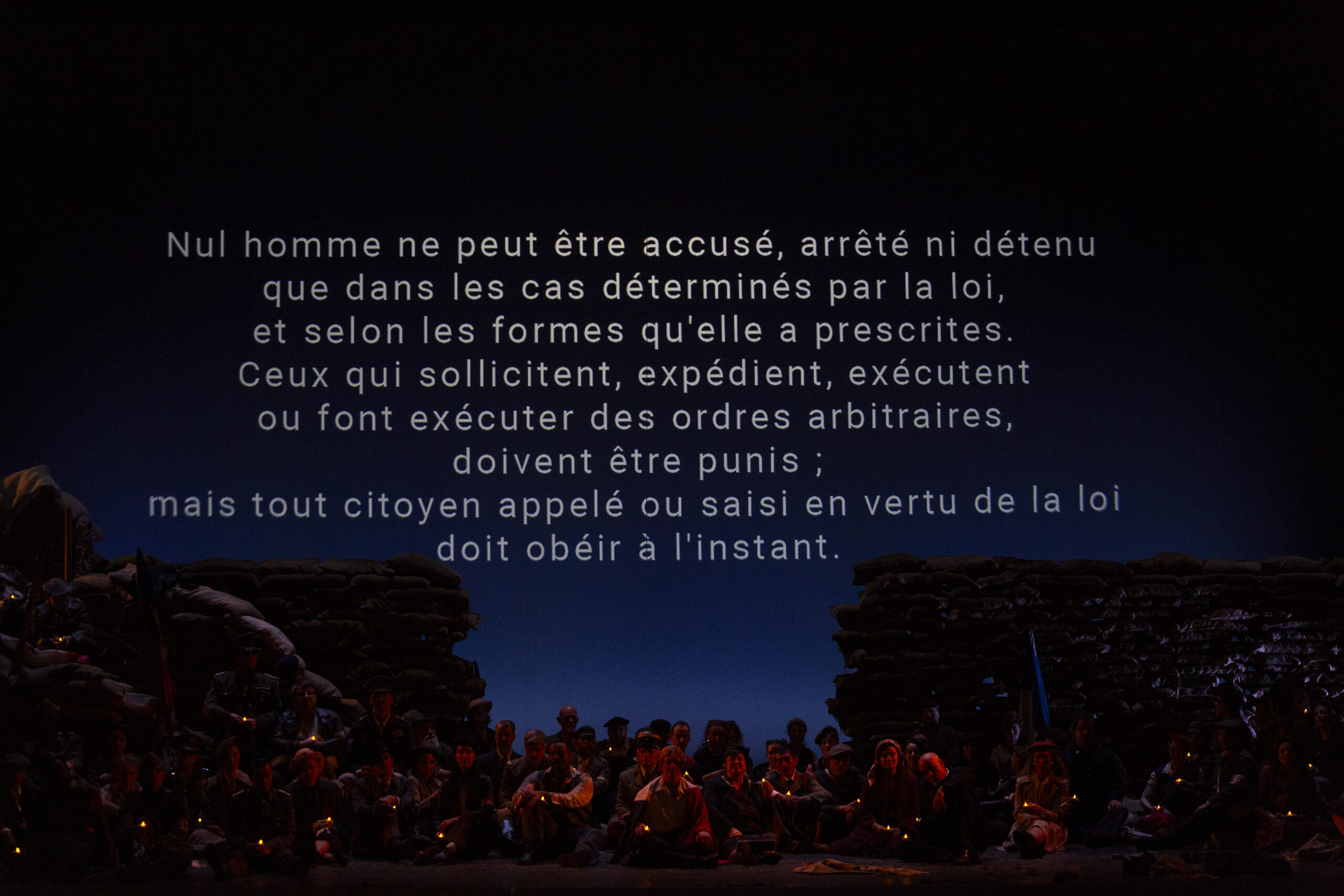 Une signifiante image que Valentina Carrasco a eu l'excellente idée de prolonger musicalement par le plus précieux des bonus musicaux : alors qu'aux premiers applaudissements des spectateurs commencent à quitter leur fauteuil, retentissent les premiers accords de Léonore III! ! Cette ouverture, troisième du nom, dont les metteurs en scène et les chefs de Fidelio ne savent généralement que faire, et ne font généralement rien mais que les amoureux de l'œuvre espèrent toujours. Valentina Carrasco se démarque de Mahler, Bernstein et Böhm, qui l'avaient incluse entre le duo des époux réunis et l'hymne final, en conviant le plus simplement du monde tous les protagonistes à s'asseoir face public et à écouter cette musique magnifique. Mais pas que : voici qu'à l'appel de trompettes, défilent quelques principes humains élémentaires glanés dans le marbre de l'Histoire en marche. Relire notamment l'Article 1 de la Déclaration des Droits de l'Homme, magnifié par la bande-son beethovénienne et quelques lumignons discrètement allumés : une idée qui n'est pas de trop, surtout aujourd'hui. Une idée qui est de surcroît totalement accordée au combat de Beethoven. Beethoven contre Hitler : à la fin, avec Valentina Carrasco, c'est Beethoven qui gagne.