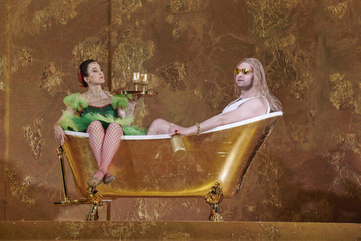 Il faut donc que Siegfried fasse tomber la façade du container pour que le trésor nous soit révélé. On y découvre le dragon et l'oiseau dans une baignoire en or massif, les murs couverts d'or. L'oiseau est une ballerine aux mouvements contraints par l'animalité (et Rinnat Moriah met dans son jeu théâtral la même vivacité que dans son chant), Fafner est un homme qui, banalement, ne sait vraiment que faire de sa richesse toute neuve. C'est pour ainsi dire sur un malentendu que Siegfried, ce brave garçon qui ne pense pas à mal, le tue – Daniel Frank est parfait en héros benêt, pour le jeu, mais aussi pour sa voix qui sait faire passer tout l'humour de son texte. La scène avec le dragon est un grand moment d'humour, mais l'émotion passe tout de même quand la bête est vaincue et parvient à la sagesse.