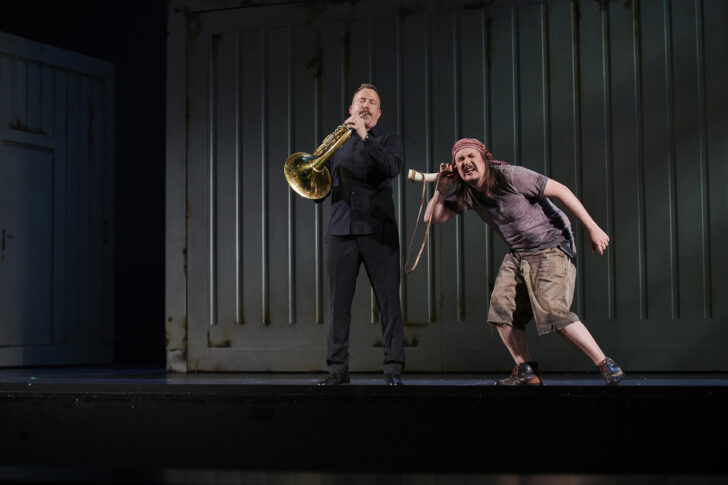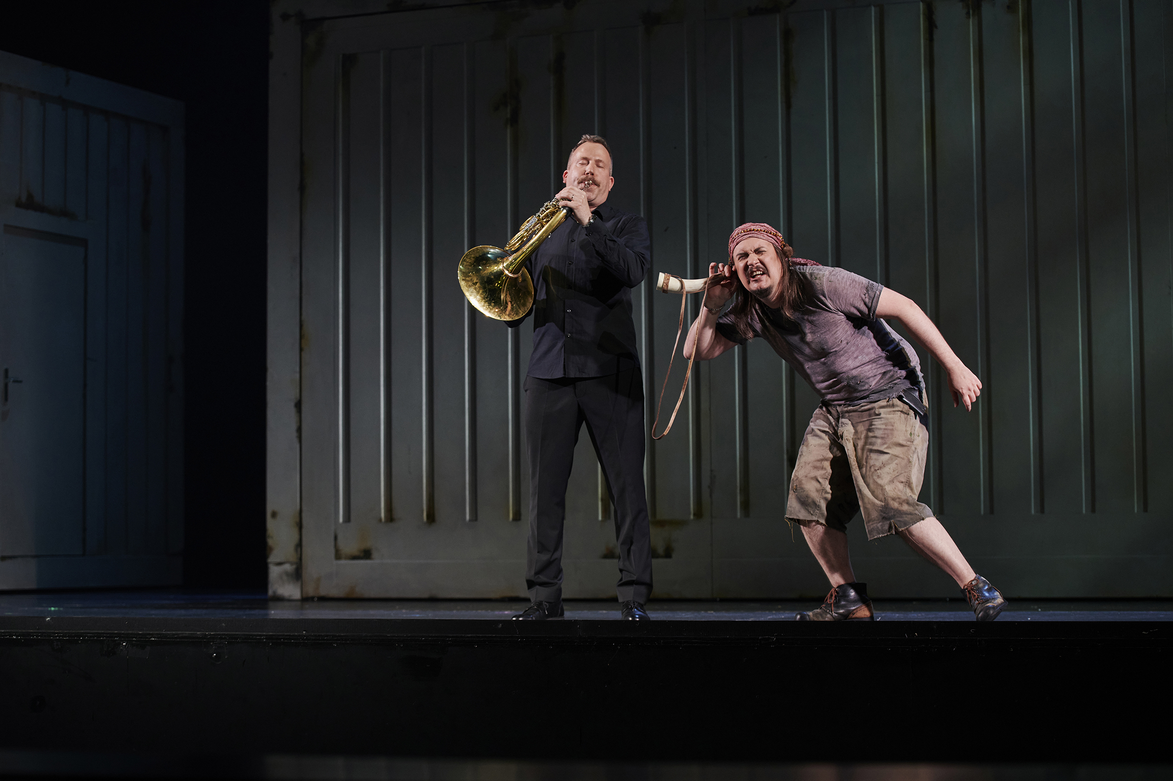 Un container, encore un, occupe la scène ; cette fois, il est fermé, masquant le repaire du dragon. C'est donc là que Mime conduit Siegfried : pas plus que dans l'acte précédent il n'est un héros de légende, mais sans aucun doute un brave gars, curieux et un peu naïf. Quand l'oiseau commence à chanter, il jette un regard curieux vers les instruments de la fosse ; quand il s'emploie à lui répondre, un corniste en chair et en os vient sur scène lui proposer son instrument, mais Siegfried préfère le laisser en jouer, et lui-même écoute avec ravissement : scène, salle, fosse, musique et théâtre, Konwitschny fait preuve d'une constante gourmandise quand il s'agit d'explorer toutes les dimensions de son art, sans jamais oublier la place royale de la musique.