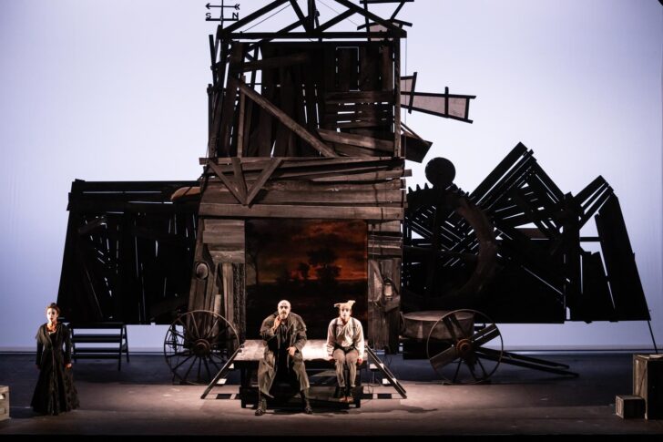 Bien que la pièce en cinq actes de Daudet soit ici réduite, réécrite même par Hervé Lacombe, grand spécialiste de Bizet, en un conte musical pour récitant, ensemble vocal et orchestre, le temps paraît long jusqu'à son tragique dénouement, et par moments l'ennui pointe. À partir de ce récit inspiré des Lettres de mon moulin, Pierre Lebon, metteur en scène, décorateur, costumier et interprète (du rôle de l'Innocent), a monté une version scénique de l'Arlésienne centrée essentiellement sur le personnage de Balthazar, vieux berger et conteur de la triste mésaventure qui pousse au suicide le jeune Frédéri, irrémédiablement attiré par la belle et volage Arlésienne, dont l'absence légendaire la tient à l'état de fantasme. Eddie Chignara endosse le rôle parlé de Balthazar dans un seul en scène ou presque, laissant de sporadiques interventions verbales aux personnages de Rose et de l'Innocent tenus par des danseurs. Le décor unique est un moulin fabriqué en planches de bois, transporté sur une vieille charrette au centre de la scène, qui fera aussi office de castelet une fois ses tréteaux déployés. Sa conception est joliment poétique, des images peintes du monde rural au XIXe siècle défilant en fond d'écran, animation à laquelle s'ajoute celle des lumières subtiles du talentueux Bertrand Killy.