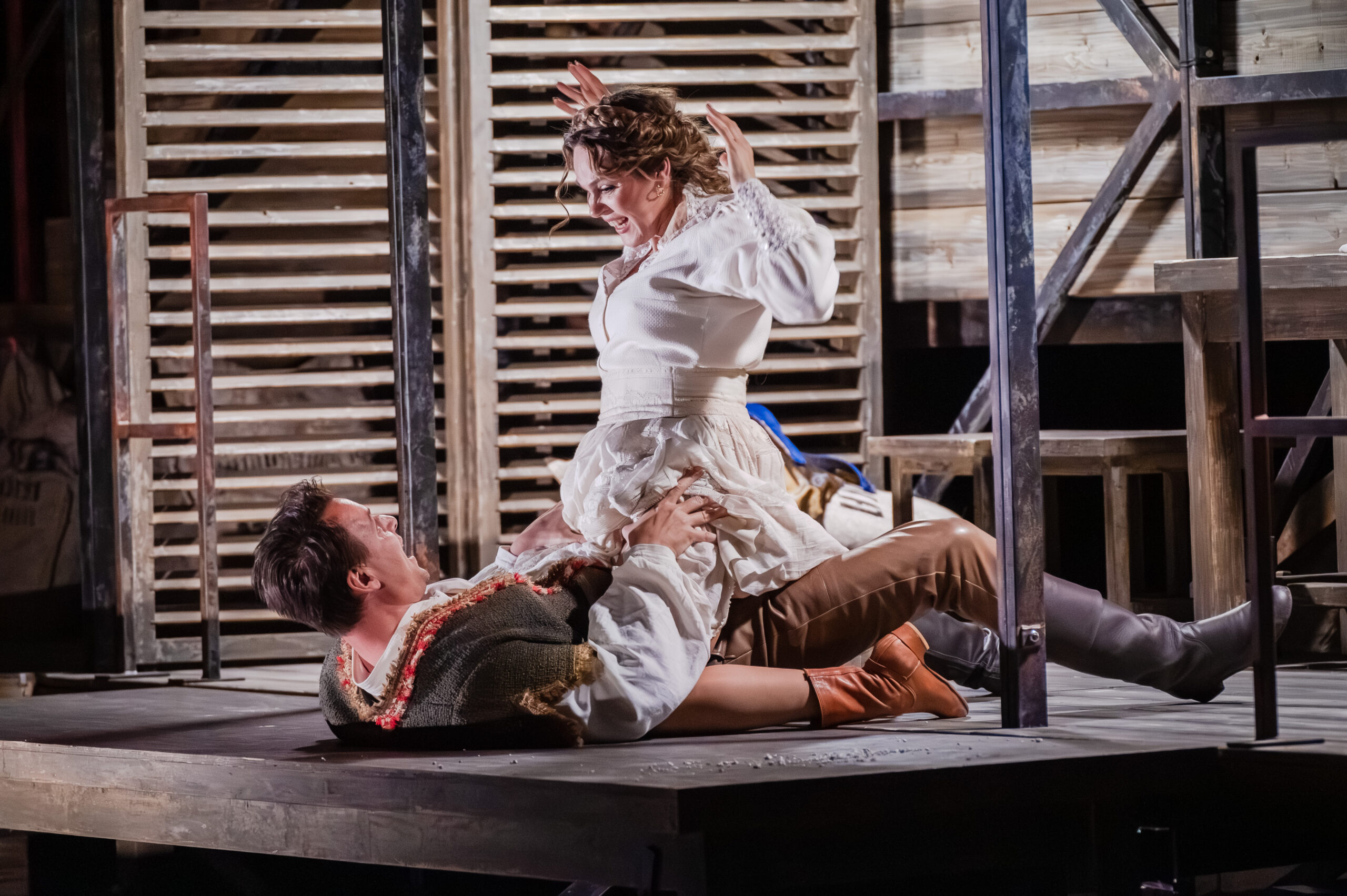 Kristine Opolais se définit comme une actrice-chanteuse, et elle dispose en effet de ces deux dimensions indispensables pour restituer le rôle de Katerina. La richesse de ses phrasés, ses aigus projetés avec assurance, son timbre homogène sur toute la tessiture, sont autant de qualités à partir desquelles elle livre ce soir une démonstration d'engagement scénique impressionnante, et forme avec Pavel Černoch en Sergueï un couple d'une grande vérité érotique et dramatique. Ce dernier est à la hauteur de sa partenaire, la souplesse de la voix et la vaillance conquérante de ses aigus dessine un Sergueï sûr de sa séduction et manipulateur en diable, comme on l'avait déjà salué en 2019 à Bastille. Dmitry Belosselskiy avec sa basse profonde qui remplit tout le théâtre est, dans le rôle du beau-père, l'incarnation du patriarcat sûr de ses principes, brutal et libidineux. Le reste de la distribution est convaincant, chacun caractérisant son personnage avec acuité, Matthias Stier en mari faible de caractère et impuissant, Merit Nath-Göbl criante de vérité pour la cuisinière Aksinya innocente et empathique, Frank Wernstedt en chef de police-Dracula assoiffé d'argent ou encore Dan Karlström en Balourd miteux, sorte d'idiot du village qui trouve la vérité et précipite l'action. Aucun maillon faible dans la distribution, tout juste les chœurs sont scéniquement quelque peu raides dans leur chorégraphies.