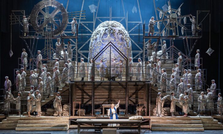 Pour Lady MacBeth, sa proposition vise au spectaculaire, classique, sans transposition, tout en ménageant quelques beaux effets autour des thèmes de la fertilité/stérilité et de la soif d'argent. Le premier tableau montre sur un premier plan la chambre de Katerina Ismailova, lieu où tout se jouera. Toute en bois, elle est surmontée d'une série d'escaliers où évoluent les personnages et de deux roues de moulin, tournant avec leurs sacs de farine à la façon d'engrenages, symbolisant un destin inexorable déjà en marche. Au milieu de cette sorte d'échafaudage trône un immense œuf de Fabergé, symbole de richesse, puissance et fertilité, que l'héroïne brisera quand elle décidera de rompre son ennui, attirée par Serguei. Les vêtements des ouvriers de la ferme sont faits dans la toile de jute des sacs de farine, tandis que les personnages principaux se démarquent en redingote et manches bouffantes pour les hommes quand Katerina Ismailova arbore jupes volantées, tresses ou coiffe de matriochka. Les lumières (Michael Röger), sans surprise, se teintent de rouge une fois le meurtre du beau-père accompli ou curieusement suivent les personnages de façon trop appuyée façon… Holiday on Ice. À l'Interlude – Passacaille décisif de l'Acte 2, tout le décor recule, comme un monde qui disparait, de façon saisissante, faisant apparaître une fosse qui recèle le corps du beau-père assassiné par le couple maudit. Le septième tableau est une autre réussite avec le bureau de police qui descend des cintres, puis y remonte de façon spectaculaire, les policiers à masques de cochons, symbole de cupidité, se livrant à une danse comique qui répond à la musique grinçante. Au dernier acte, le trou qui représentait la cave se transforme en lac tournoyant où vient se noyer Sonietka tandis que le metteur en scène prend ses distances avec le livret en épargnant Katerina. Sur les dernières notes de l'œuvre, ce sont l'ensemble des prisonniers – dont Katerina – qui disparaissent petit à petit en s'enfonçant dans ce trou. La littéralité dans une musique aussi expressive a le mérite de l'efficacité, mais cette approche atteint ses limites dans les deux scènes du viol de la cuisinière Aksinja et de la scène de sexe de Katerina avec son amant.
