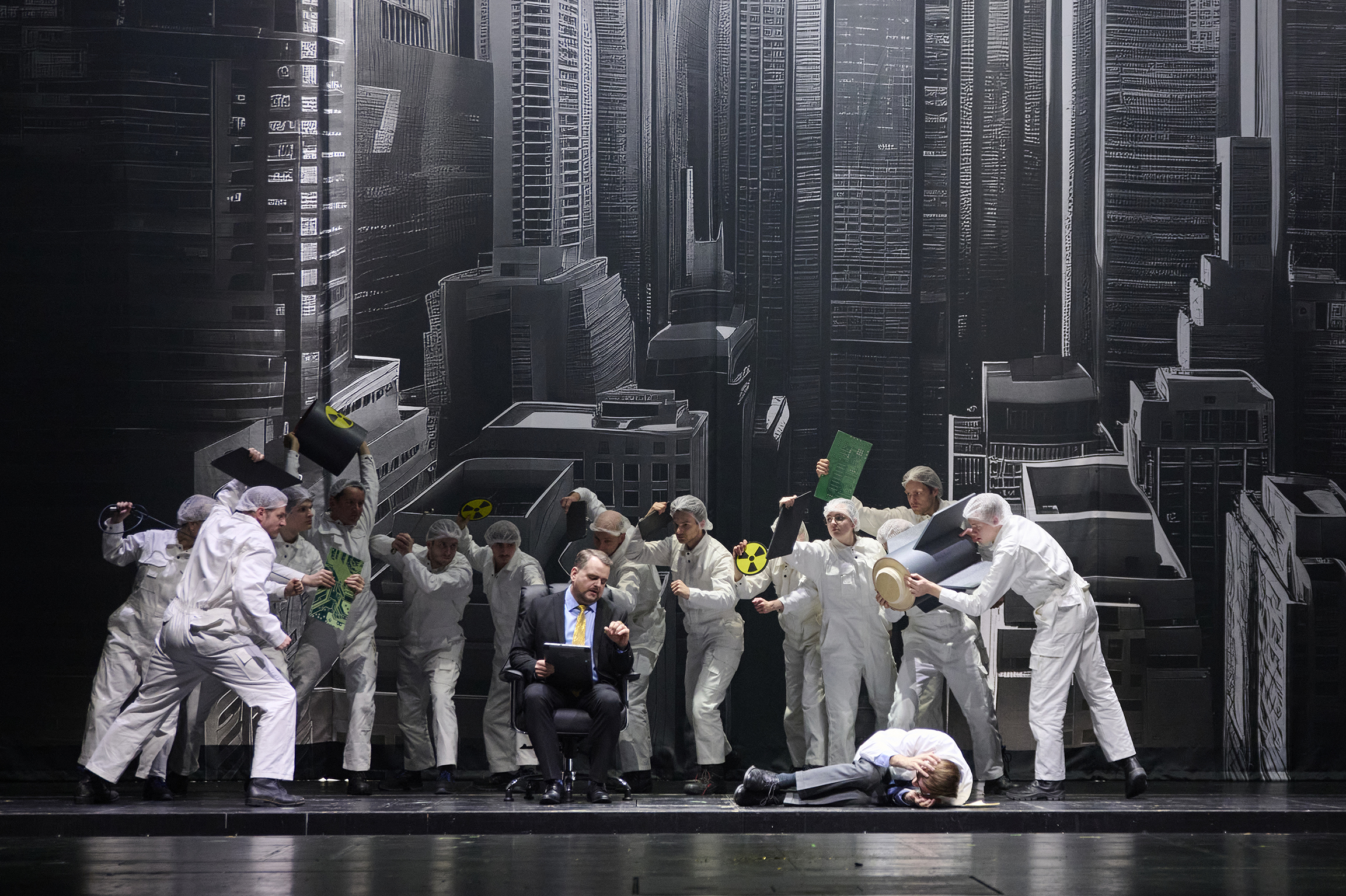 Pour la dernière apparition de Wotan, c'est Michael Kupfer-Radecki qui l'incarne : irréprochable vocalement, il reste un peu pâle dans l'incarnation du personnage ; c'est la mise en scène qui le veut, lui refusant le grand format et le destin exceptionnel pour n'en faire qu'un homme parmi tant d'autres. Il trouvera sans doute l'occasion de s'affirmer plus nettement dans d'autres propositions théâtrales. Le reste de la distribution est tout à l'honneur du théâtre de Dortmund, entre membres de la troupe et invités ; le bon trio de filles du Rhin dominé par la Flosshilde somptueuse de Marlene Gaßner n'en est qu'un exemple de bon augure pour l'ensemble de l'opéra. Tous bénéficient de la direction de Gabriel Feltz, cette fois théâtrale de bout en bout et très bienveillante envers les chanteurs : ce n'est pas parce que Konwitschny offre un spectacle fort que la musique s'en trouve sacrifiée, mais il est tout de même bienvenu que la musique et la scène semblent constamment marcher d'un même pas.
