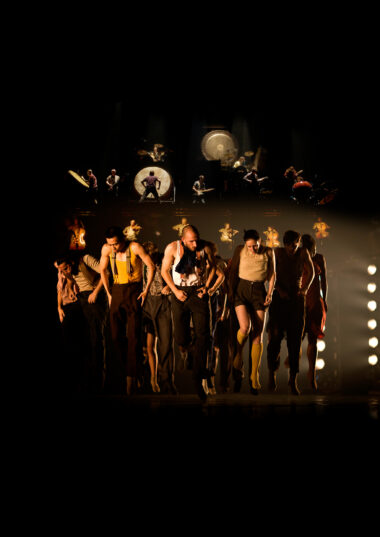 Les vingt-quatre musiciens et leurs instruments géants, grosses caisses, percussions et cordes protégées par l'auvent, comme en terrasse, sont nichés sur une structure verticale accueillant à l'étage les percussions, et au rez-de-jardin les contrebasses et violoncelles. Ce sont les gongs qui émergent de l'ombre en premier, éclairés de halos vifs, par intermittence, porteurs des prémisses de cette prometteuse version XXL de Political Mother, de Hofesh Schechter. Sous-titré « The Choregrapher's Cut », le nouveau montage grand angle du chorégraphe, allusion au cinéma avec ses travellings avant et arrière, se cale à la jauge du Grand-théâtre.