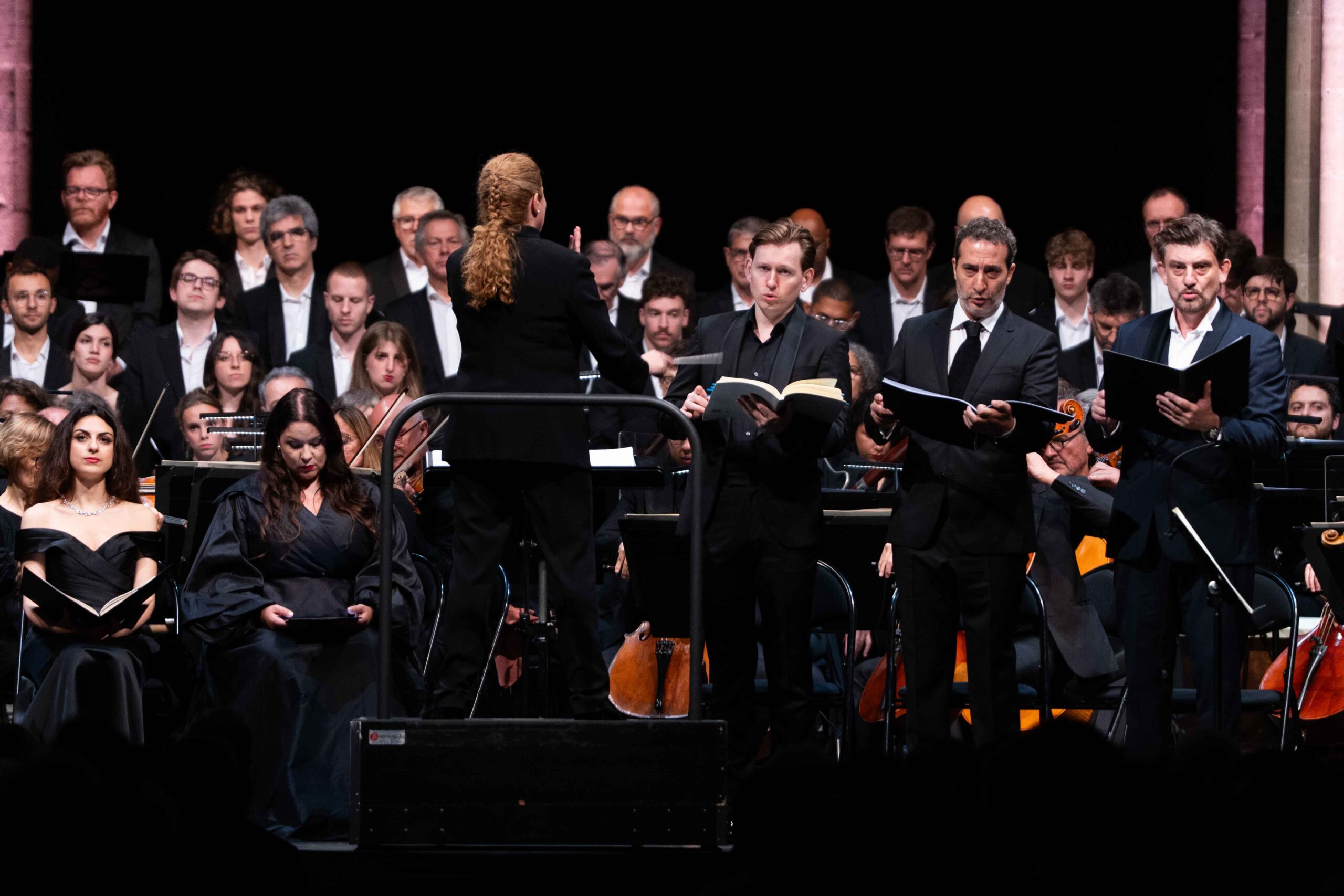 Le Tuba Mirum met en valeur les hommes, lancé par Vito Priante, auquel répond la voix plus aigüe du ténor Bogdan Volkov soutenue par celle pleine de gravité de la basse Jean Teitgen, se distinguant également dans d'autres parties. L'Ingemisco revient au seul ténor, solide pour faire passer l'émotion de cette très belle partie, toujours bien portée à l'orchestre par l'italianité de Scappucci. D'ailleurs, l'œuvre offre aussi d'intéressants solos aux instrumentistes et met en avant le premier violoncelle et surtout la première violon Ann-Estelle Médouze, ou donne de l'importance aux cuivres et aux timbales, invisibles à droite de la scène. Avec quelques moments pour elles, la soprano Claudia Muschio et la mezzo-soprano Alisa Kolosova complètent le quintette en offrant aussi un très bon équilibre et en apportant de la luminosité aux tutti, dont celui du final, puissant Libera me, Domine.