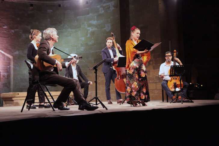 Dans la grande nef de l'ancienne cathédrale de Maguelone, le violon de Louise Ayrton ouvre le bal, progressivement rejoint par les autres instruments (la viole de gambe de Lucas Peres, la contrebasse de Simon Giudicelli et la guitare de Vincent Dumestre) . Son archet danse littéralement et déroule des guirlandes de diminutions sur le thème de l'Españoleta. L'enchaînement entre les pièces instrumentales et vocales est impeccable, et l'arrivée de la mezzo-soprano Isabelle Druet à l'avant-scène se fait tout naturellement. Le jeu de scène expressif de la chanteuse, aussi à l'aise pour exprimer les tourments amoureux que dans les intermèdes parlés, démontre d'évidentes qualités théâtrales déjà reconnues. Une introduction aux percussions solo de Joël Grare fait surgir de drôles de haricots géants. Le dialogue entre la voix et les ritournelles du violon permet à Louise Ayrton d'offrir des diminutions virtuoses d'une grande liberté rythmique. On sent une belle complicité entre les musiciens, où chacun semble libre de s'échapper dans une improvisation qui relance le discours. Le rythme de la danse est contagieux et entraîne chacun dans une farandole implacable. Après ce tourbillon, un bis ramène le calme grâce à la nostalgie intemporelle d'une chanson de la tradition séfarade. Un festival qui s'achève en apothéose.
