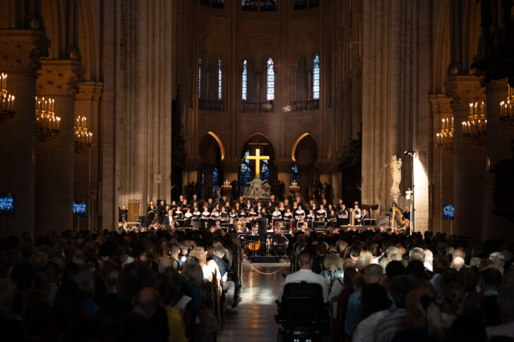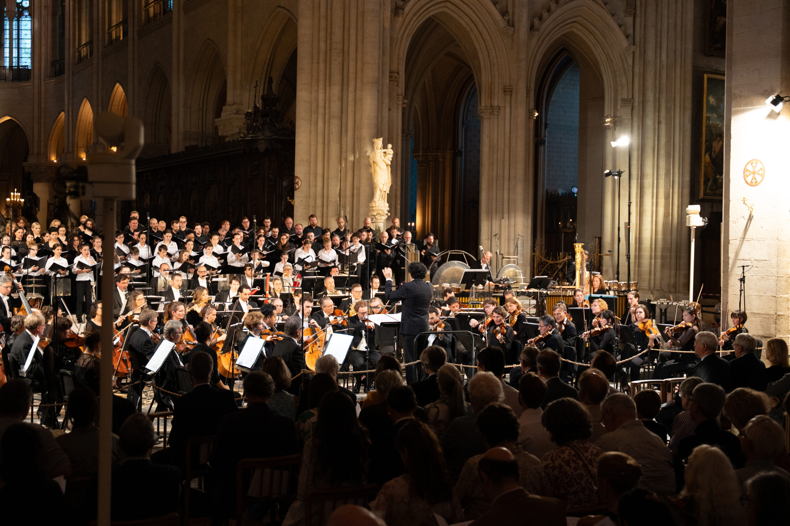 Sans surprise, celui qui avait été le compositeur d'honneur du Festival Présences 2018 utilise pour l'orchestration une écriture colorée et toujours lyrique, qui s'adapte aux attentes du public et de cette cérémonie de réouverture. Le chef Alain Altinoglu est à la direction et entre en scène juste après le discours du recteur-archiprêtre des lieux, Monseigneur Olivier Ribadeau Dumas. Relativement longue, la partition tourne parfois sur les mêmes idées, desservie aussi par une acoustique qui ne permet pas d'y entrer en détail, notamment quand une petite fanfare (deux trombones, deux cors) quitte la scène pour tenter de donner un son plus lointain à leurs parties. Malgré cela, on peut juger de la bonne qualité de préparation du HR Sinfonieorchester (l'orchestre de la radio de Francfort) sous les gestes évidents du chef français, d'ailleurs aussi clair pour diriger le chœur Ils seront tous à réentendre dans l'enregistrement à paraître prochainement.