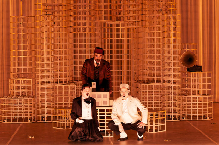Dès l'Ouverture, le voilage vaporeux qui sert de rideau de scène se voit griffé de la si élégante calligraphie arabe : Istanbul 1925. Une époque où la Turquie, tentée elle aussi par une laïcité à la française, s'affranchissait, sous l'impulsion de son premier président de la république Mustapha Kemal Pacha (dit Atatürk) de coutumes jusque là peu soucieuses de parité entre les genres. Une période dont se souvient, plongé dans ses souvenirs à l'avant-scène, le Pacha Selim de Mozart vu par Jean-Christophe Mast. Une période qui va être celle de l'opéra ainsi qu'annoncée, toujours sur le rideau de scène, par de nouveaux caractères arabes : Quelques années plus tôt…