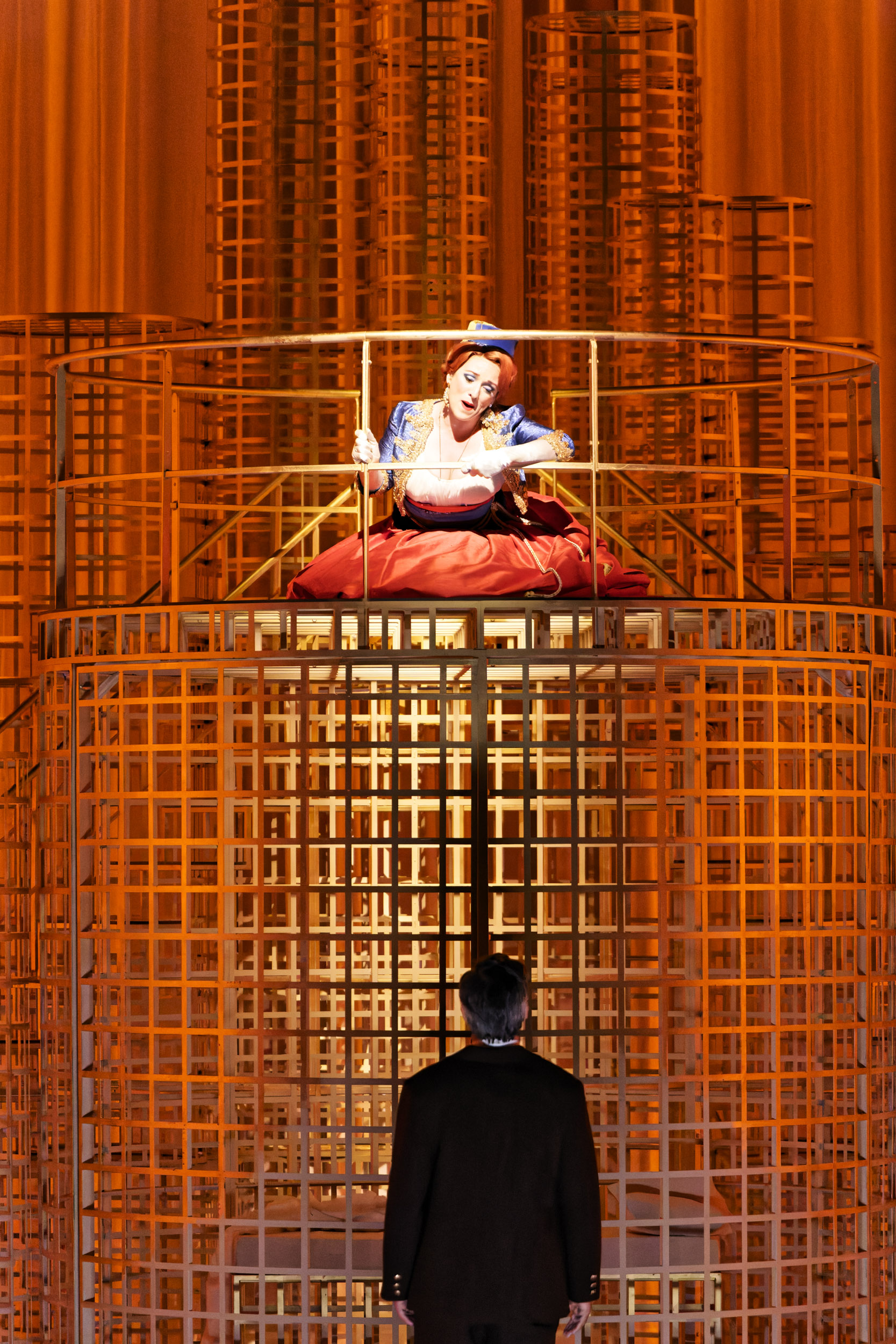 Le rideau vaporeux se lève sur l'entrée en solitaire d'un homme au centre d'un gigantesque hémicycle de voilages : Belmonte. Comme égaré, il contemple la lente descente des cintres de ce qui se révèle être le sérail de Selim : une structure ajourée, sorte de volière modulable avec chambre, terrasse, prison… On comprend vite qu'il s'agit d'une cage dorée. Tout est d'or mais tout reste cage, les arbres (dorés au pulvérisateur par le jardinier Osmin) comme le mobilier posé alentour sur le plateau, dans cette scénographie dont l'élégance et le luxe du jeu d'orgues sont impuissants à masquer la désolante signifiance.